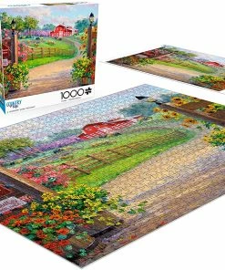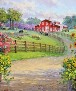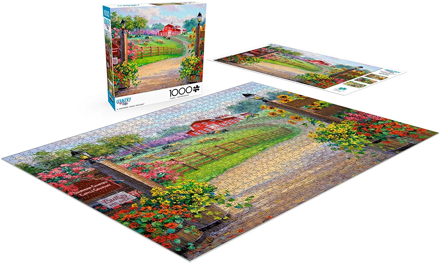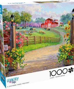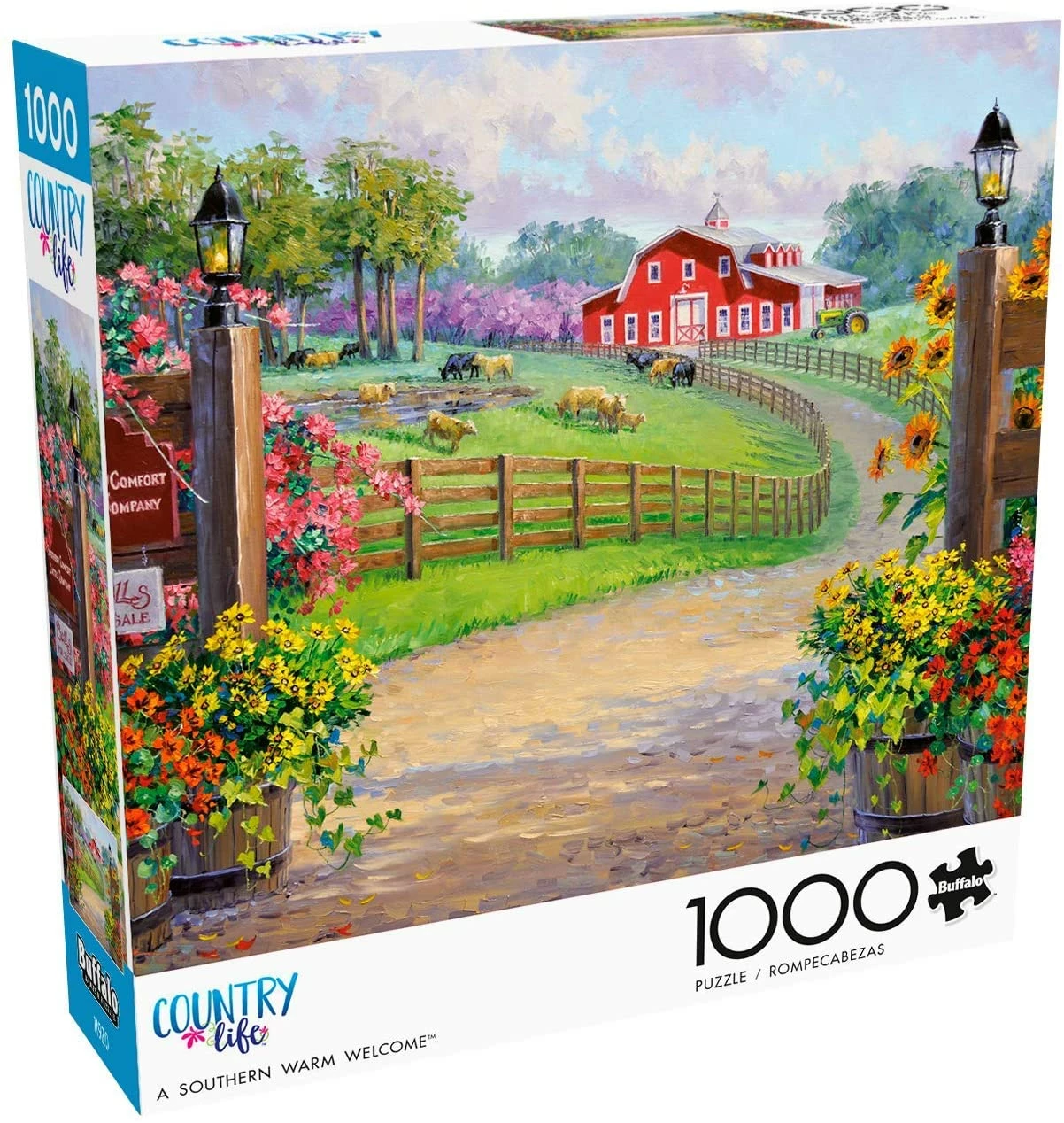 A Southern Warm Welcome is a 1,000-piece jigsaw puzzle from the Country Life Series by Buffalo Games. This puzzle features a big red barn at the end of a driveway lined with a wooden fence. On the other side of the fence, cows roam about. The farm is complete with colorful trees and flowers.Β