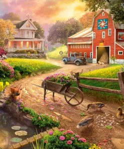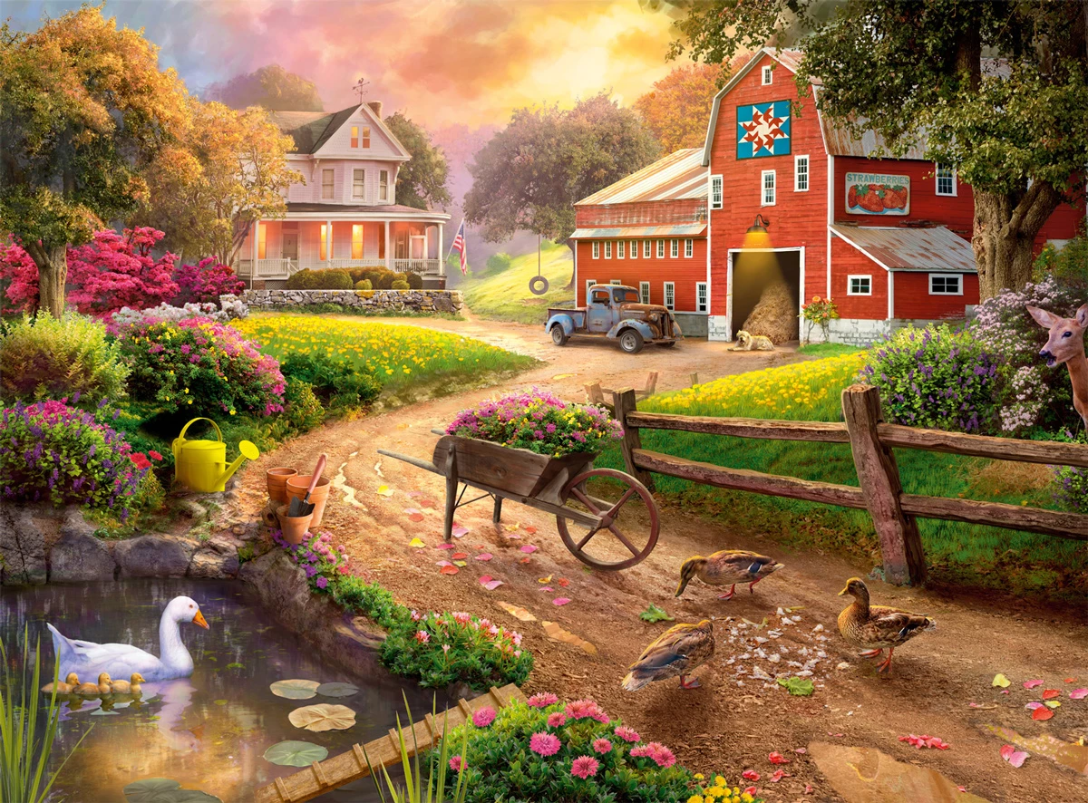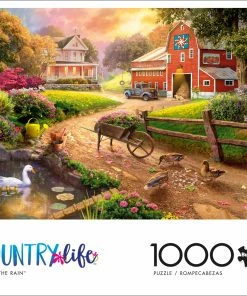After the Rain is a 1,000-piece jigsaw puzzle from the Country Life Series by Buffalo Games. This puzzle shows a beautiful farm after a rain storm. The sun is shining, the grass is glistening, and the animals are back to wandering about. Can you spot all of the animals living on the farm?Β