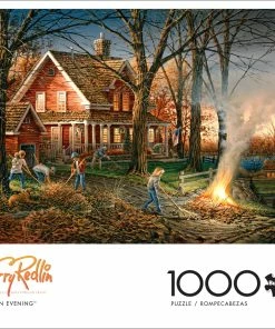 This 1000-piece jigsaw puzzle titled Autumn Evening by famed painter Terry Redlin depicts a fall afternoon of family raking. The leaves have fallen as the trees get ready for winter in this picturesque scene. A family rakes up and burns the leaves outside their cozy home in the countryside as the sun sets in the background. U.S. ART magazine dubbed Terry Redlin βAmericaβs Most Popular Artistβ every year from 1991 to 1998 and inducted him into their Hall of Fame in 1992 for his use of earthy colors, blazing sunrises and sunsets, and nostalgic themes. Today, over 2 million of Terryβs tranquil, heartwarming art prints grace the homes of his collectorsβmaking him βAmericaβs Favorite Artist.β