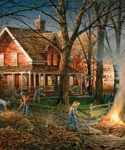 This 1000-piece jigsaw puzzle titled Autumn Evening by famed painter Terry Redlin depicts a fall afternoon of family raking. The leaves have fallen as the trees get ready for winter in this picturesque scene. A family rakes up and burns the leaves outside their cozy home in the countryside as the sun sets in the background. U.S. ART magazine dubbed Terry Redlin βAmericaβs Most Popular Artistβ every year from 1991 to 1998 and inducted him into their Hall of Fame in 1992 for his use of earthy colors, blazing sunrises and sunsets, and nostalgic themes. Today, over 2 million of Terryβs tranquil, heartwarming art prints grace the homes of his collectorsβmaking him βAmericaβs Favorite Artist.β