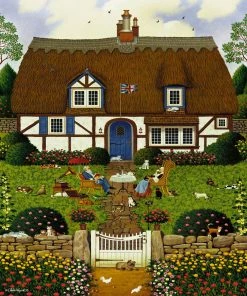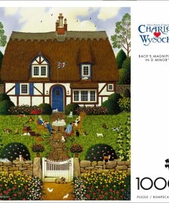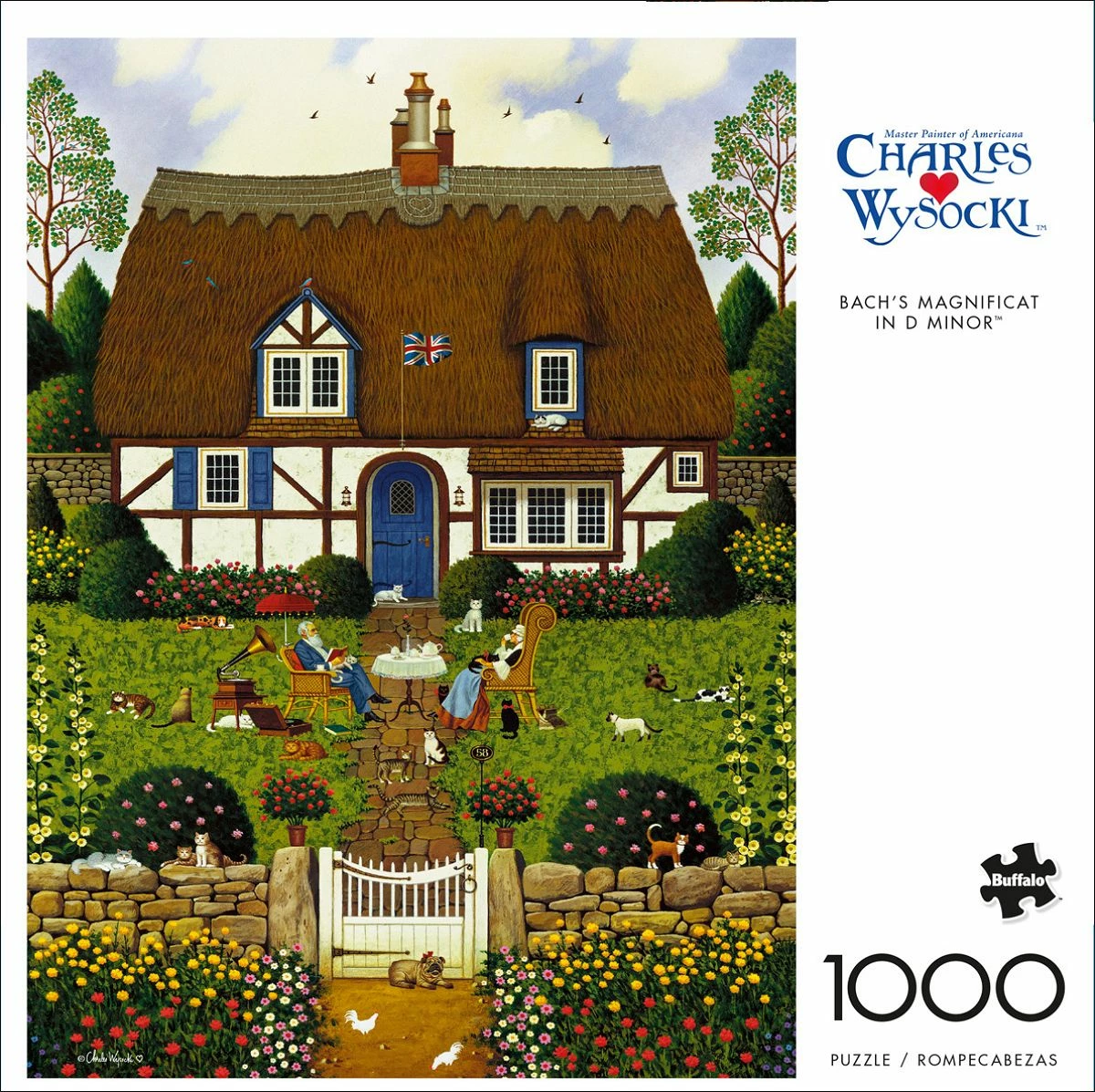 This 1000-piece puzzle, Bach’s Magnificat in D Minor, features a charming English home surrounded by lovely flowers and shrubs. An old couple can be seen sitting on the pathway to the door, enjoying their time as they are kept company by their six cats.Β