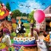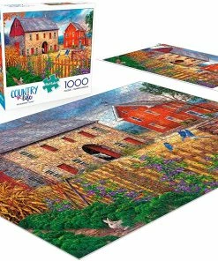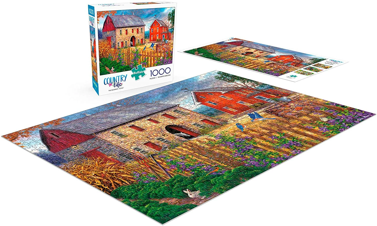 The Bluebirdsβ Song is a 1,000-piece jigsaw puzzle from the Country Life Series, by Buffalo Games, which showcases bold images reflected in the puzzle to create a unique challenge. The Bluebirdsβ Song features a few Bluebirds atop a wooden fence looking out at the farm. They can see a red and cobblestone barn that is home to a white horse, the water well, and the red farmhouse off to the side. The bluebirds have other bird friends in a Cardinal and an Oriole. They are joined by a rabbit who is waiting for the right time to take a nibble out of the garden.Β