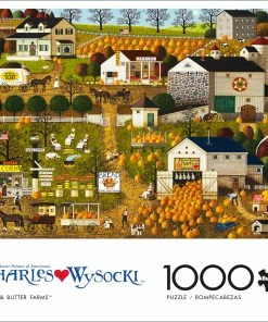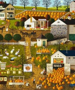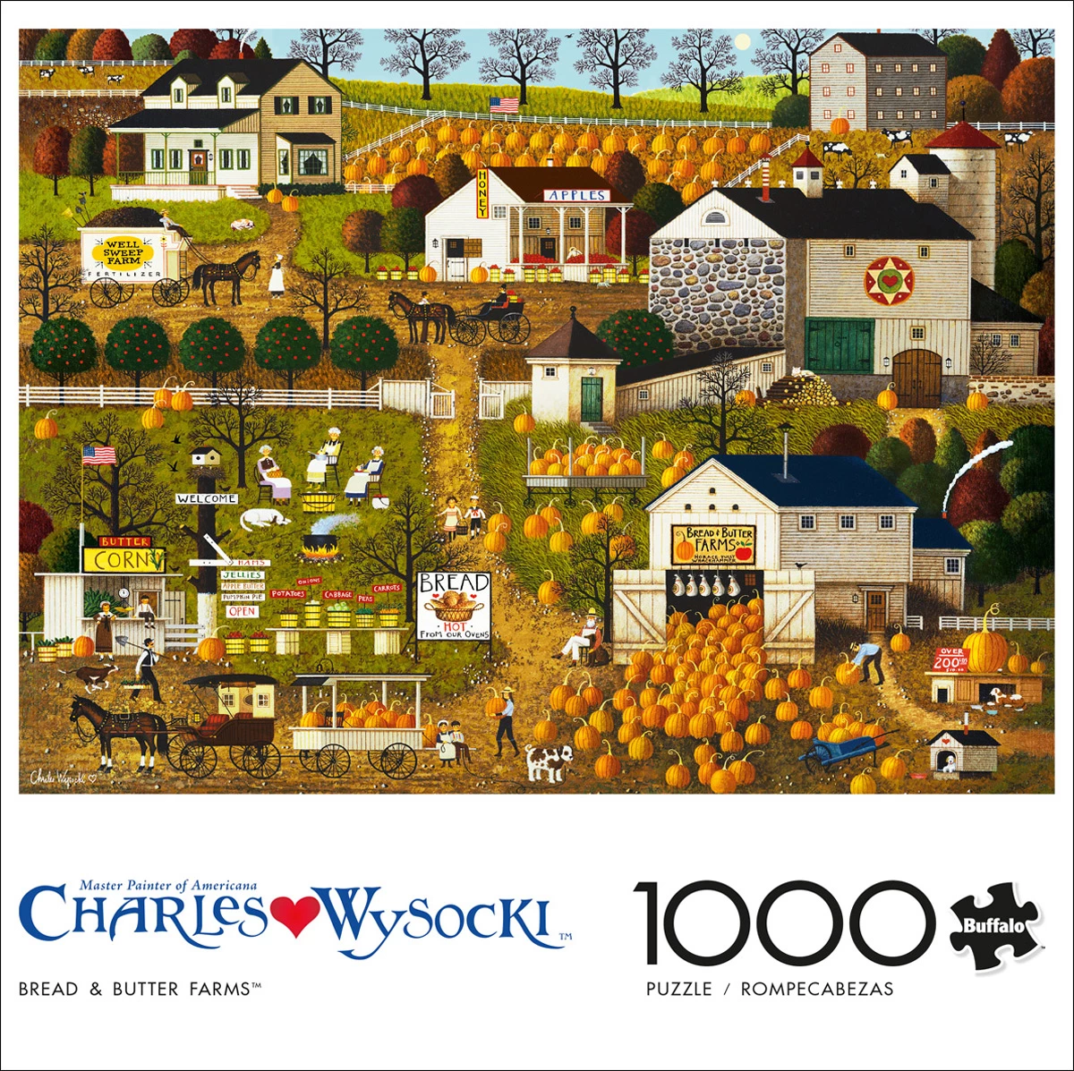 This 1,000-piece jigsaw puzzle, Bread & Butter Farms, is by artist Charles Wysocki. Enjoy a perfect autumn day at the farm! Eat some freshly baked bread, pick a pumpkin from the pumpkin patch, or pick up some fresh vegetables from the veggie stand. If you really want to make Halloween special, you can buy a pumpkin weighing over 200 pounds for only $10!Β