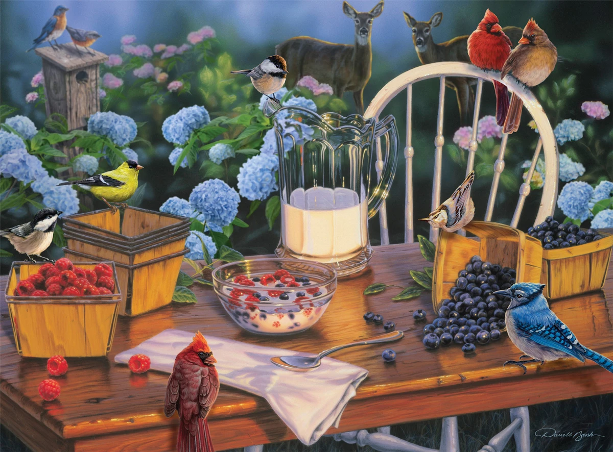 This 1000-piece jigsaw puzzle by artist Darrell Bush, titled Country Breakfast Club, brings out the bird enthusiast in all of us! Β Colorful blue and pink flowers surround the breakfast table filled with fruits and cereal and attracts a variety of birds.