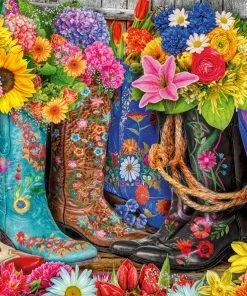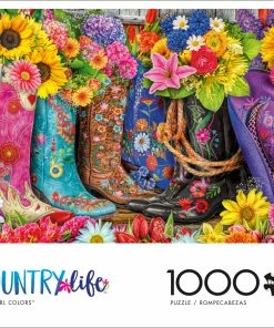 This 1000-piece jigsaw puzzle, Cowgirl Colors, is from the Country Life series by Buffalo Games. Colorful cowboy boots are makeshift vases for vibrant flowers in this fun americana puzzle. Which combination is your favorite? Country Life series is chock-full with layered images of flowers, birds, quilts, wheel barrows, flags, dogs, and other rustic themed images.
