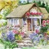 This 1000-piece jigsaw puzzle, Farm Flower Pups, is part of the Country Life Series by Buffalo Games. A pair of golden retrievers lead their puppies along a path past a field of sunflowers toward the farm house. A hen and her chicks can be seen next to the path as some sparrows fly by overhead. In the background, a rustic red barn can be seen.Β