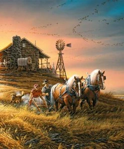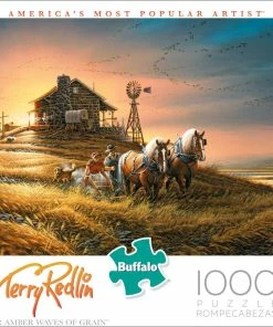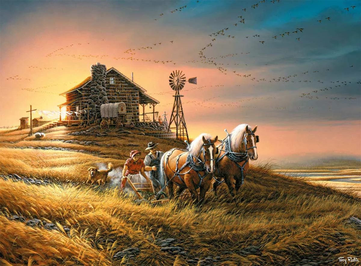 This 1000-piece jigsaw puzzle titled For Amber Waves of Grain by famed painter Terry Redlin depicts a farmer plowing his fields of wheat while his trusty dog follows closely behind. The birds overhead form a symmetric V-shaped flight formation as they start to migrate for the season. The farmerβs covered wagon and cabin can be seen in the background as the sun sets.