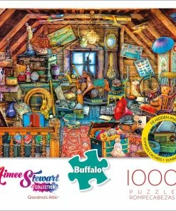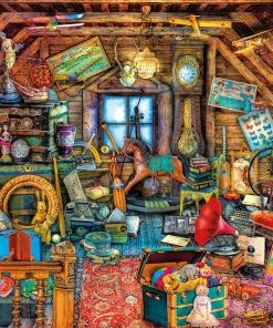 This 1000-piece jigsaw puzzle, βGrandmaβs Attic,β is based on the artwork of Aimee Stewart. This attic is filled with antique treasures and vintage surprises. Old toys, games, instruments, furniture, and more fill every nook and cranny in this crowded storage space. This jigsaw puzzle has 10 hidden images for you to find as you piece it together!