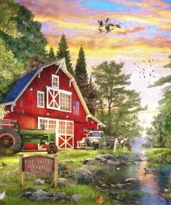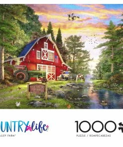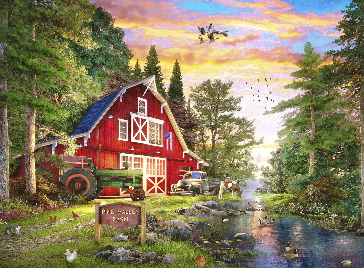 This 1000-piece jigsaw puzzle, Pine Valley Farm, is part of the Country Life Series by Buffalo Games. Visit a rustic red barn nestled in the woods next to a creek. Animals surround the barn including a cow, chickens, geese, birds flying overhead and even a curious cat.Β