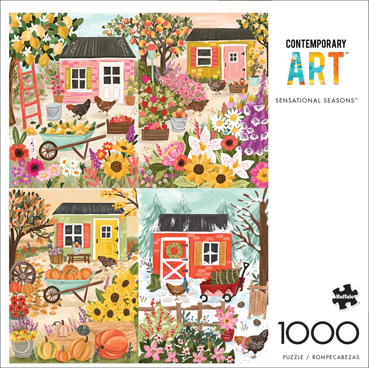 Sensational Seasons is a 1000-piece jigsaw puzzle from the Buffalo Games Contemporary series. This puzzle features charming illustrations of spring, winter, fall, and summer. Flowers bloom and the strawberries are ripe in spring. In winter, snow falls and a Christmas tree can be seen in the wheelbarrow. Fall brings a harvest of orange pumpkins and summer shows lemon trees full of fruit. No matter the season, the chickens are always getting into something!Β
