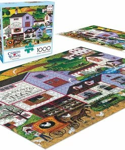Virginia’s Nest is a quaint farm town nestled in the hills of rural Virginia. Chicken feed, eggs, jellies and jams are just the staples that make this hamlet essential for the town goers to feed their animals, their crops and their families. This 1,000 piece puzzle titled Virginiaβs Nest is by artist Charles Wysocki.