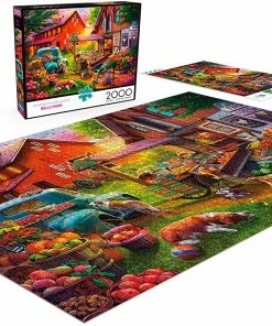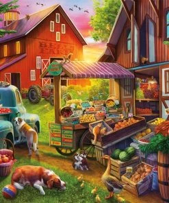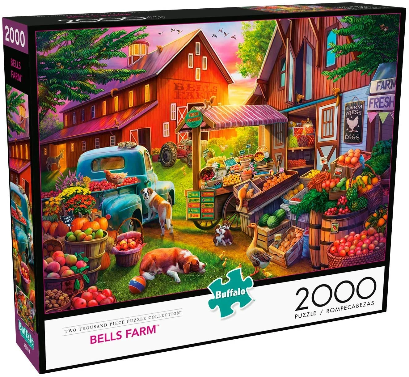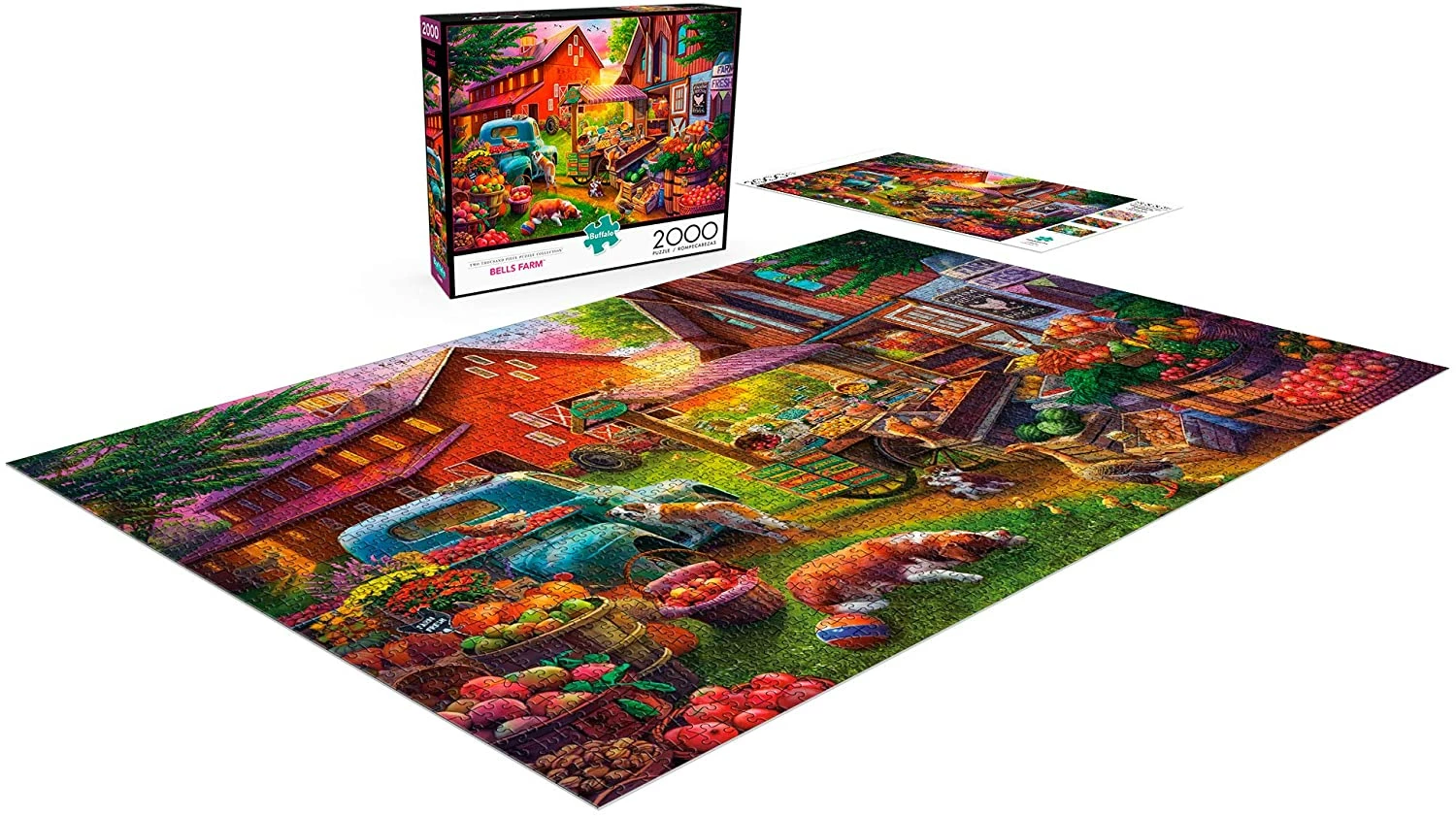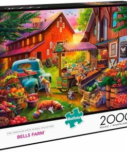 A plethora of fruits and vegetables are for sale at the Bells Farm farmersβ market in this 2000-piece puzzle titled Bells Farm from Buffalo Games. Apples, carrots, pumpkins, berries, an even freshly cut flowers are available at this seasonal stand. When picking out your produce, donβt forget to stop and pet the dogs and cats that are scattered around the farm.