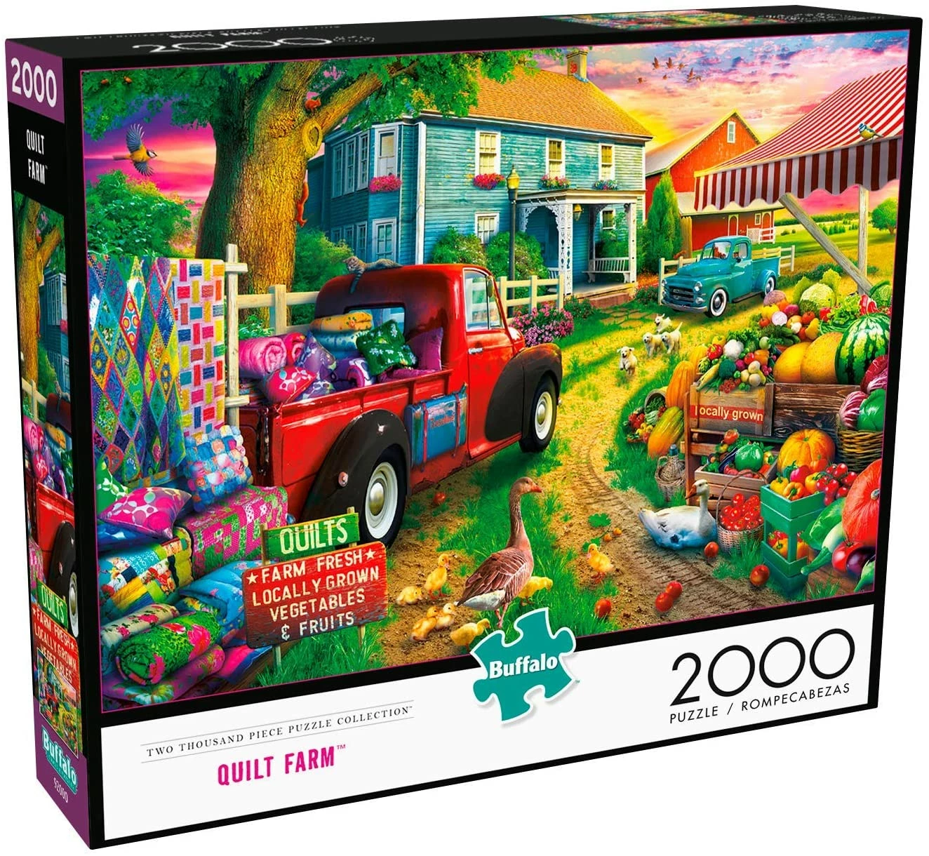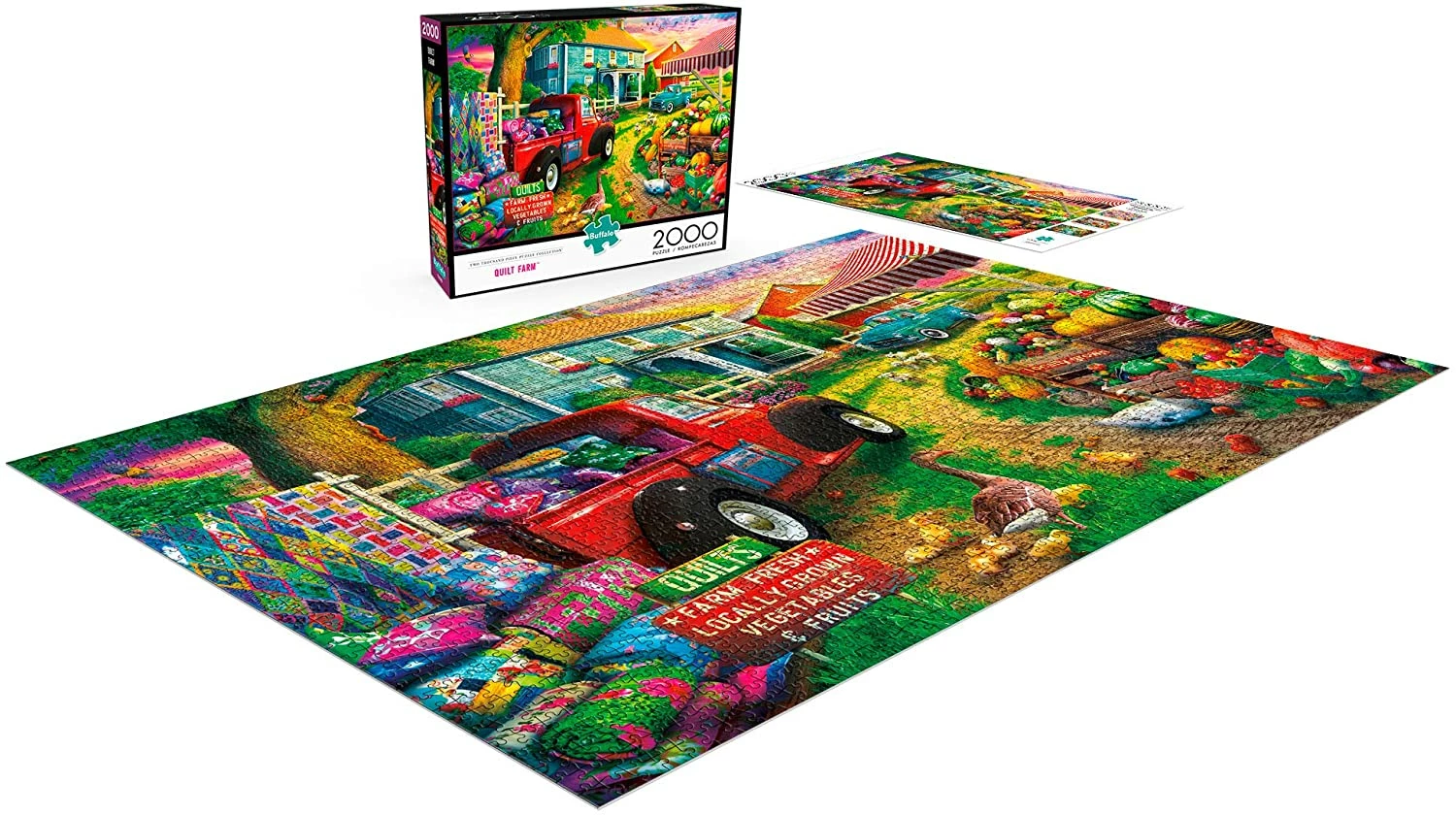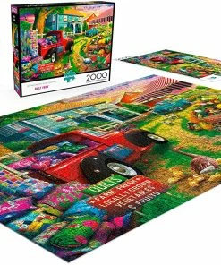 In this bright and colorful puzzle, a classic red pickup truck carries an array of homemade quilts. Enjoy piecing together this colorful and detailed puzzle. This 2,000 piece puzzle, Quilt Farm, is part of the 2000 Piece Puzzle Collection by Buffalo Games.Β