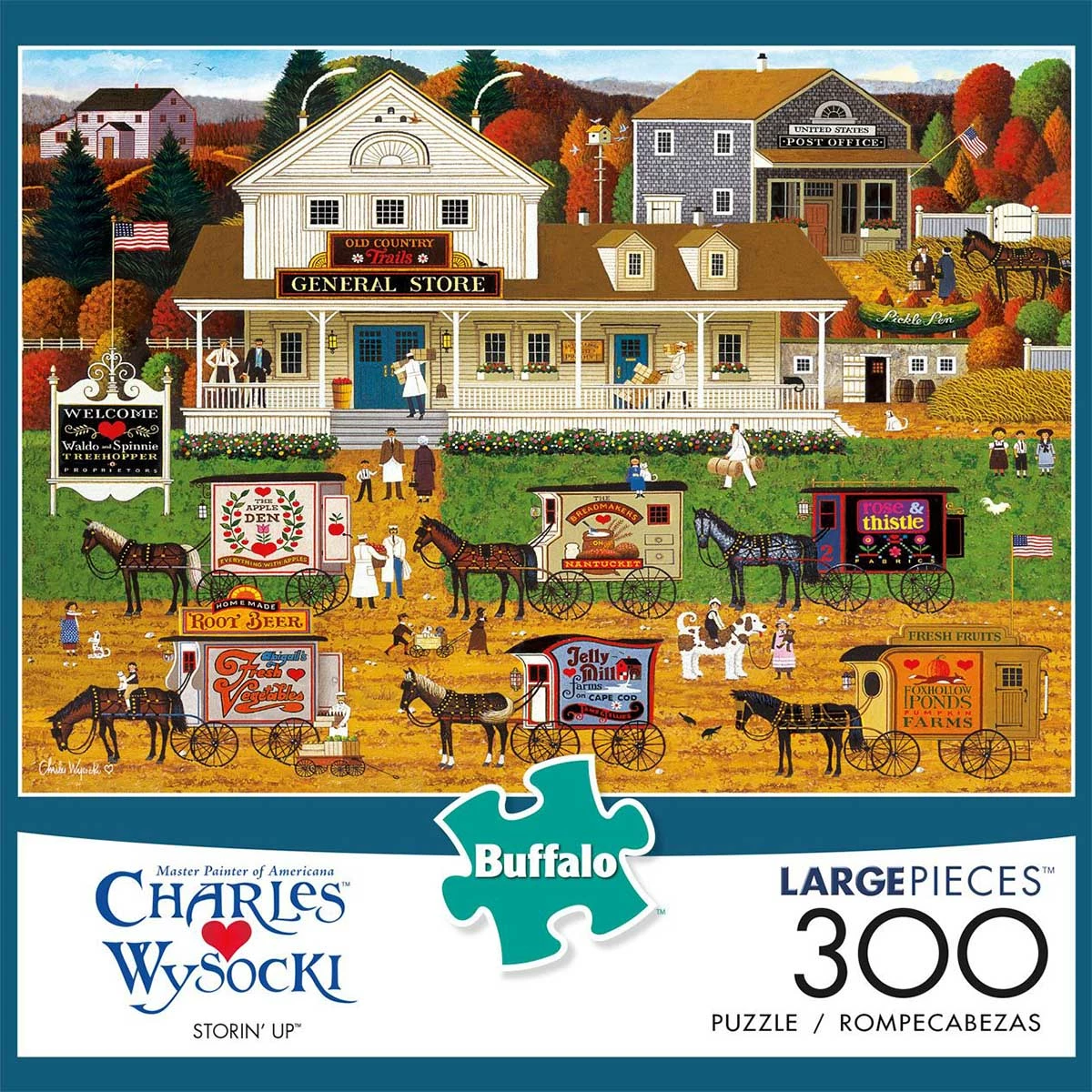 Storinβ Up, by famed master painter Charles Wysocki, is a 300-piece jigsaw puzzle that takes you back to a quaint New England town on a blue sky-filled autumn day. All the horse-drawn vendors are delivering their goods to the Old Country Trails General Store. Everything from apples, bread and jams to vegetables and fabric are making their way into the store. The porch and front yard are filled with delivery folks and customers alike. The horses wait patiently in line for their owners to return as the children play with their dogs in the street.