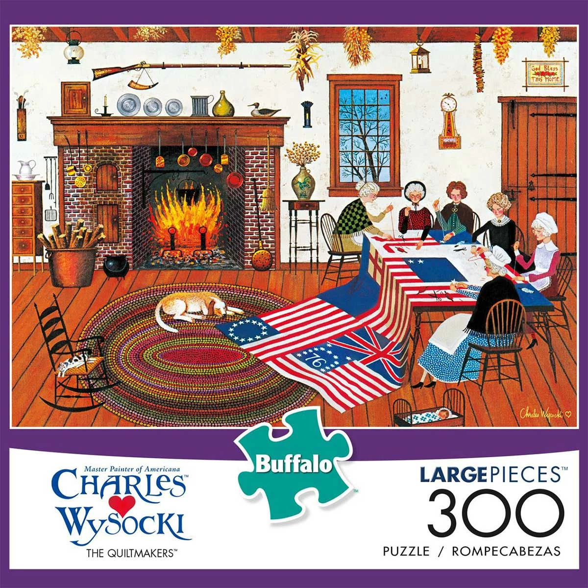 It is 1700βs America, and these women are in the process of creating a quilt of the original American flag, representing the 13 colonies. Quilts can be seen in a variety of different styles and be created in a number of ways. There are vast traditional values and culture embedded within oneβs quilt, as it can represent the values and culture of a particular place. This puzzle titled The Quiltmakers is a 300-piece jigsaw puzzle by artist Charles Wysocki. Β