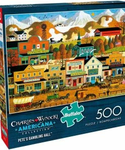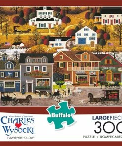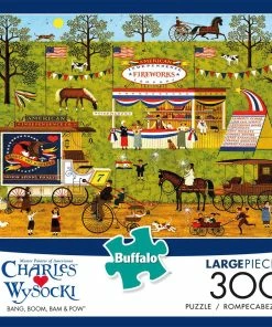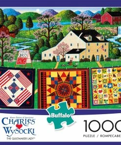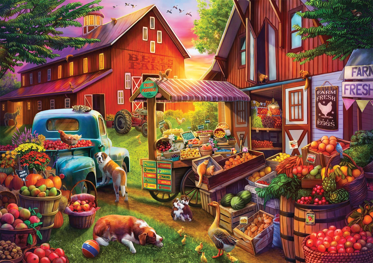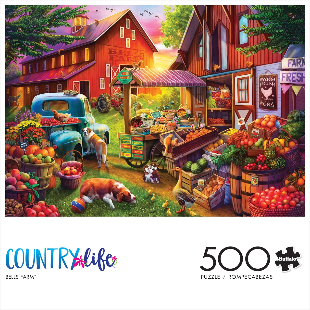 This 500-piece jigsaw puzzle, Bells Farm, is part of the Country Life Collection by Buffalo Games. A plethora of fruits and vegetables are for sale at the Bells Farm farmers’ market. Apples, carrots, pumpkins, berries, an even freshly cut flowers are available at this seasonal stand. When picking out your produce, don’t forget to stop and pet the dogs and cats that are scattered around the farm. Every Buffalo Games jigsaw puzzle is manufactured from recycled puzzle board. A precision cutting technique guarantees that every piece will fit soundly with the company’s signature Perfect Snap™. A bonus puzzle poster is also included so that you have a handy reference of what the completed puzzle should look like while you put yours together.