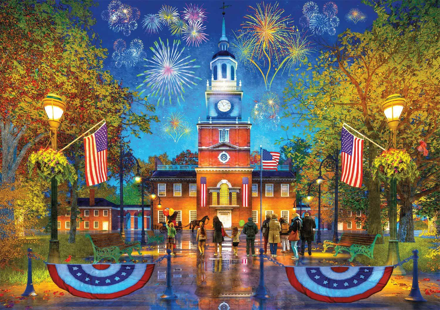 A colorful display of fireworks are launched into the night sky, over Independence Hall, as a few spectators are caught enjoying this marvelous sight. Enjoy this patriotic puzzle as you place each piece. This 500-piece puzzle, Independence Hall, is part of the Old Glory collection by Buffalo Games.Β