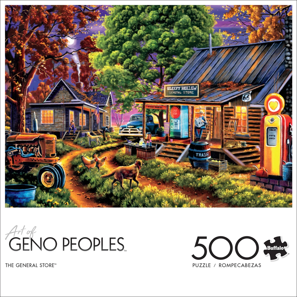 Based on the artwork of Geno Peoples, this 500 piece jigsaw puzzle titled The General Store showcases a colorful image of the Sleepy Hollow General Store, antiques, animals and good βole country living.Β