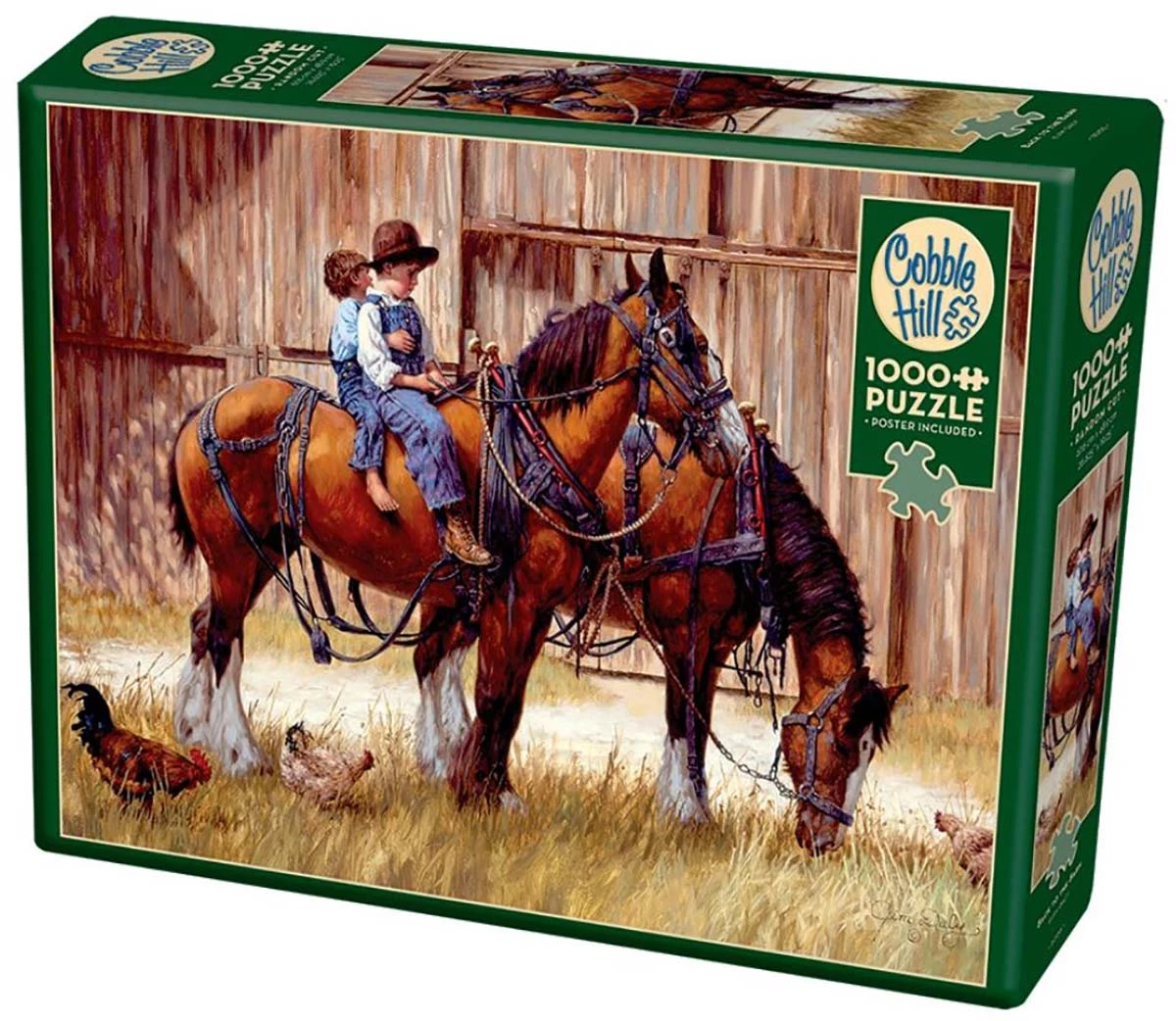 Artist, Jim Daly, captures the essence of Cobble Hill’s endearing puzzles in this beautiful 1000 piece jigsaw of big brother Steve giving young Dylan a horse ride Back to the Barn.