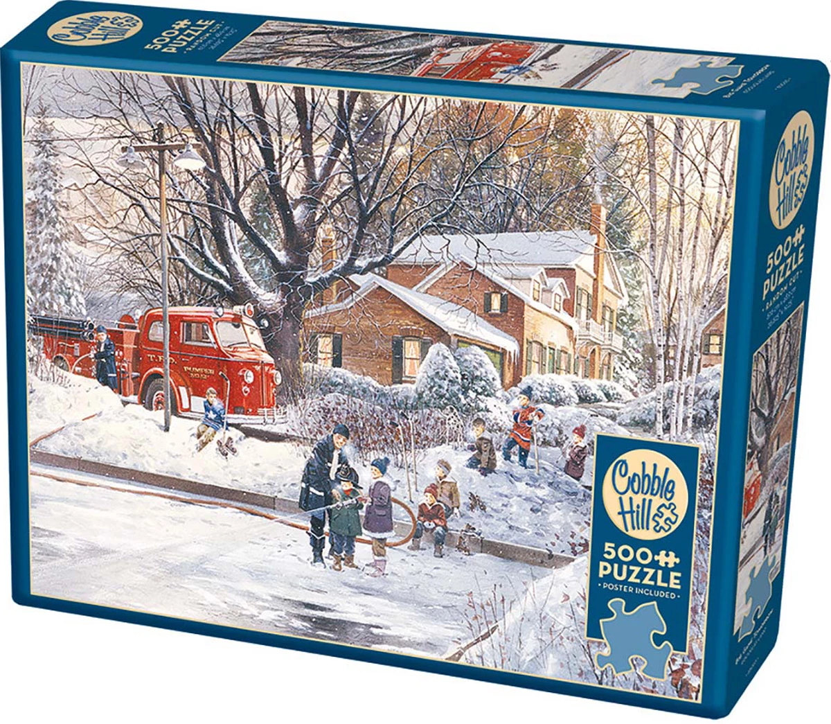 The fire department has brought their big red firetruck to spray the hockey ice pond, with the help of town kids, in preparation for the Big Game Tomorrow. A delightful 500 piece puzzle.