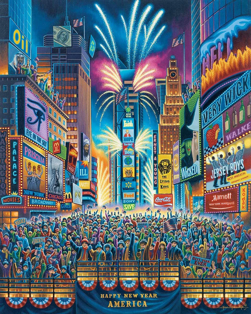Get your friends together and prepare for the night of your life as you experience frostbite in the most exuberant way possibleβthat’s right, on New Year’s Eve in Times Square! The crowds of celebratory people, streets lined with neon lights, and entertainers galore pack the night and this painting. Originally midnight was marked by fireworks off of the Times building, but the ball-drop has long-been the traditional way to ring in the new year.