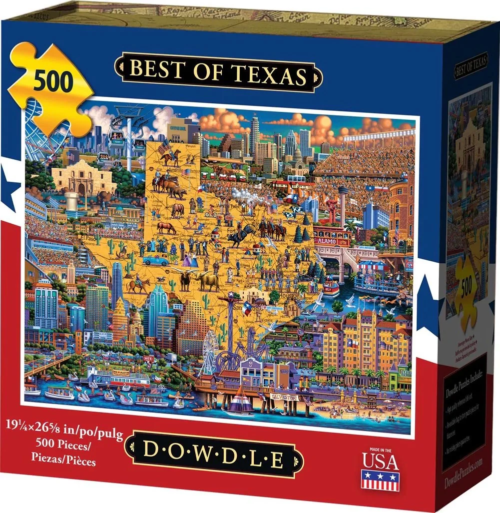 In the 500 piece jigsaw puzzle, Best of Texas by Dowdle Folk Art, an illustration of all things Texas is depicted. The artist, Eric Dowdle, made this illustration colorful, detailed, and interesting. This 10+ puzzle has dimensions of 16″ x 20″ which makes this a fun and challenging activity to do with the entire familyβespecially if you love Texas!