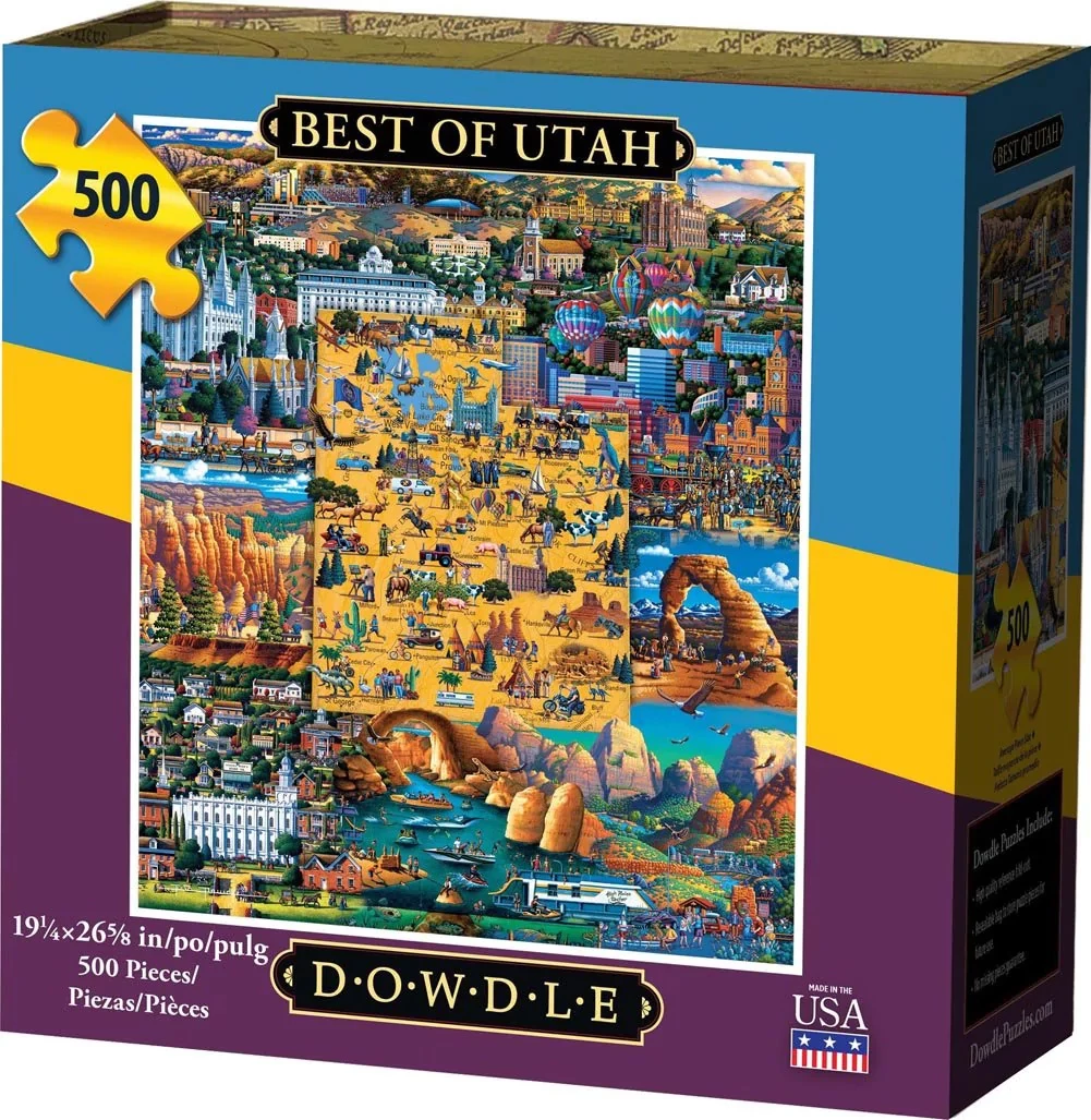 In the 500 piece jigsaw puzzle, Best of Utah by Dowdle Folk Art, an illustration of all things Utah Β is depicted. The artist, Eric Dowdle, made this illustration colorful, detailed, and interesting. This 10+ puzzle has dimensions of 16″ x 20″ which makes this a fun and challenging activity to do with the entire familyβespecially if you love Utah!
