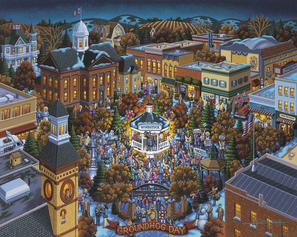 February 2 has been known for centuries as Groundhog Day, the day when humans look to a chubby, meteorologically gifted rodent to tell us if there will be 6 more weeks of winter or an early spring. Growing out from the German Christian tradition of Candlemas, Groundhog Day has become part of the American collective consciousness. Eric takes on Groundhog Day with his painting of Woodstock, IL where the famous movie by the same name was filmed. In his painting he not only pays homage to the classic film but also to the charm and character if this great little town. Turn back the clock and spend some time in Woodstock, IL for Groundhog Day. Will he see his shadow?