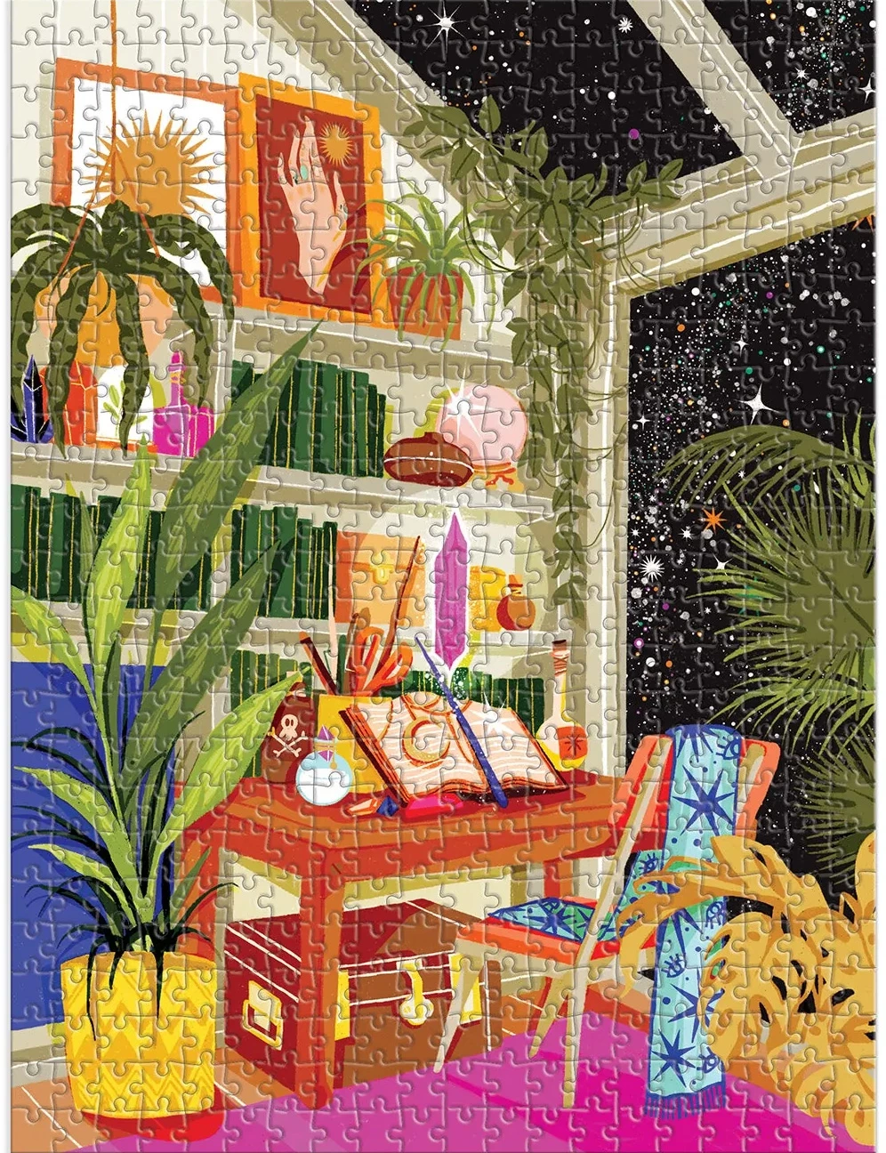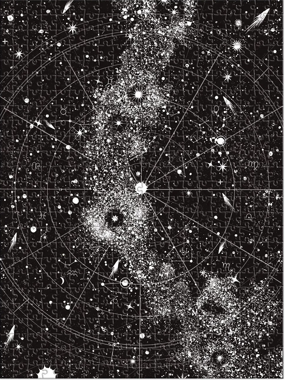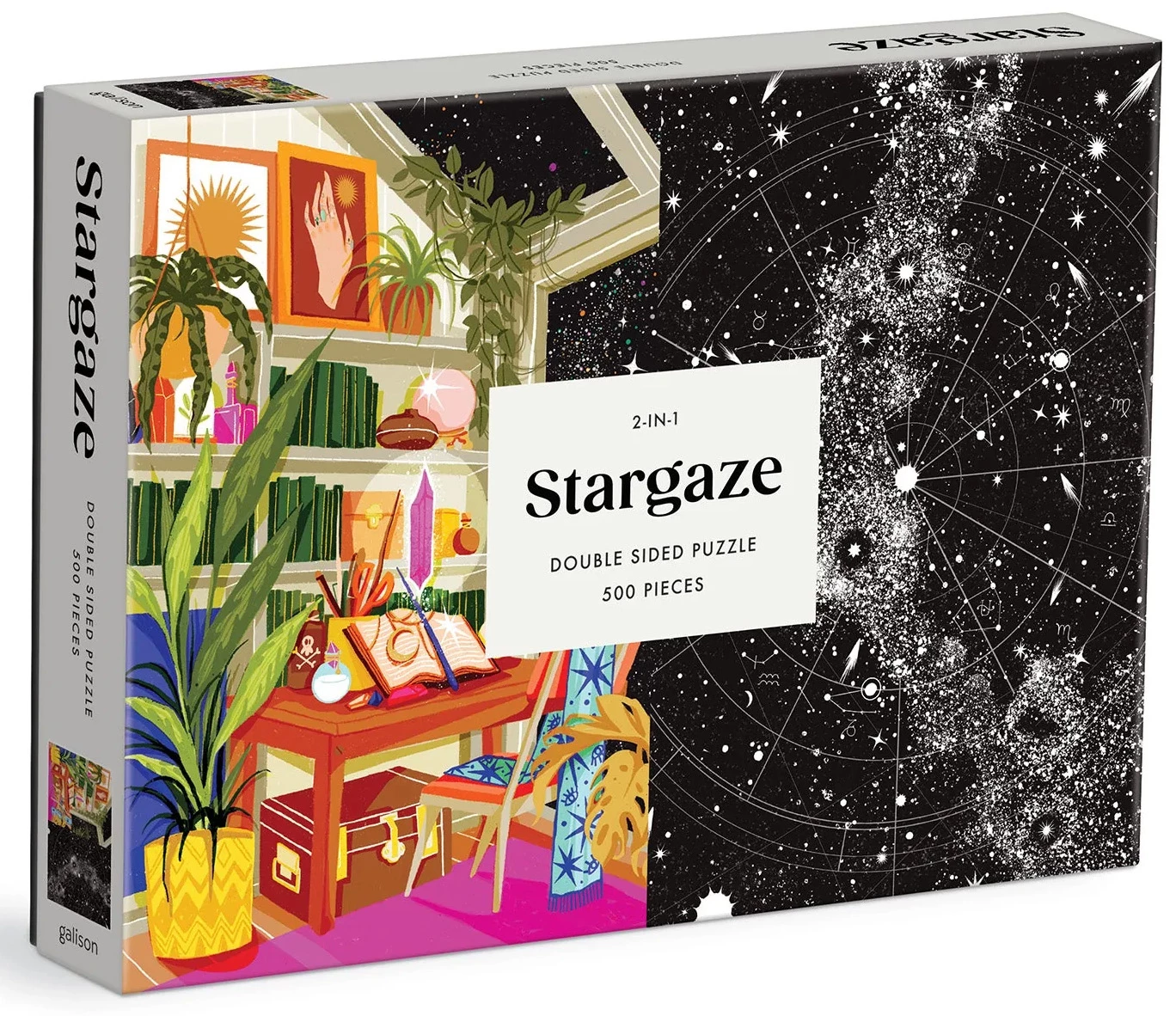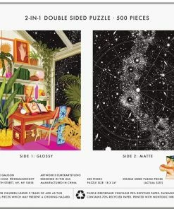 Galisonβs Stargaze 500 Piece Double Sided Puzzle features a colorful interior home scene on one side and the wonders of the cosmos on the other side for a fun and challenging puzzling experience. Puzzle pieces are printed matte on one side and glossy on the other side for easy sorting. Galison puzzles are packaged in matte-finish sturdy boxes, perfect for gifting, reuse, and storage.