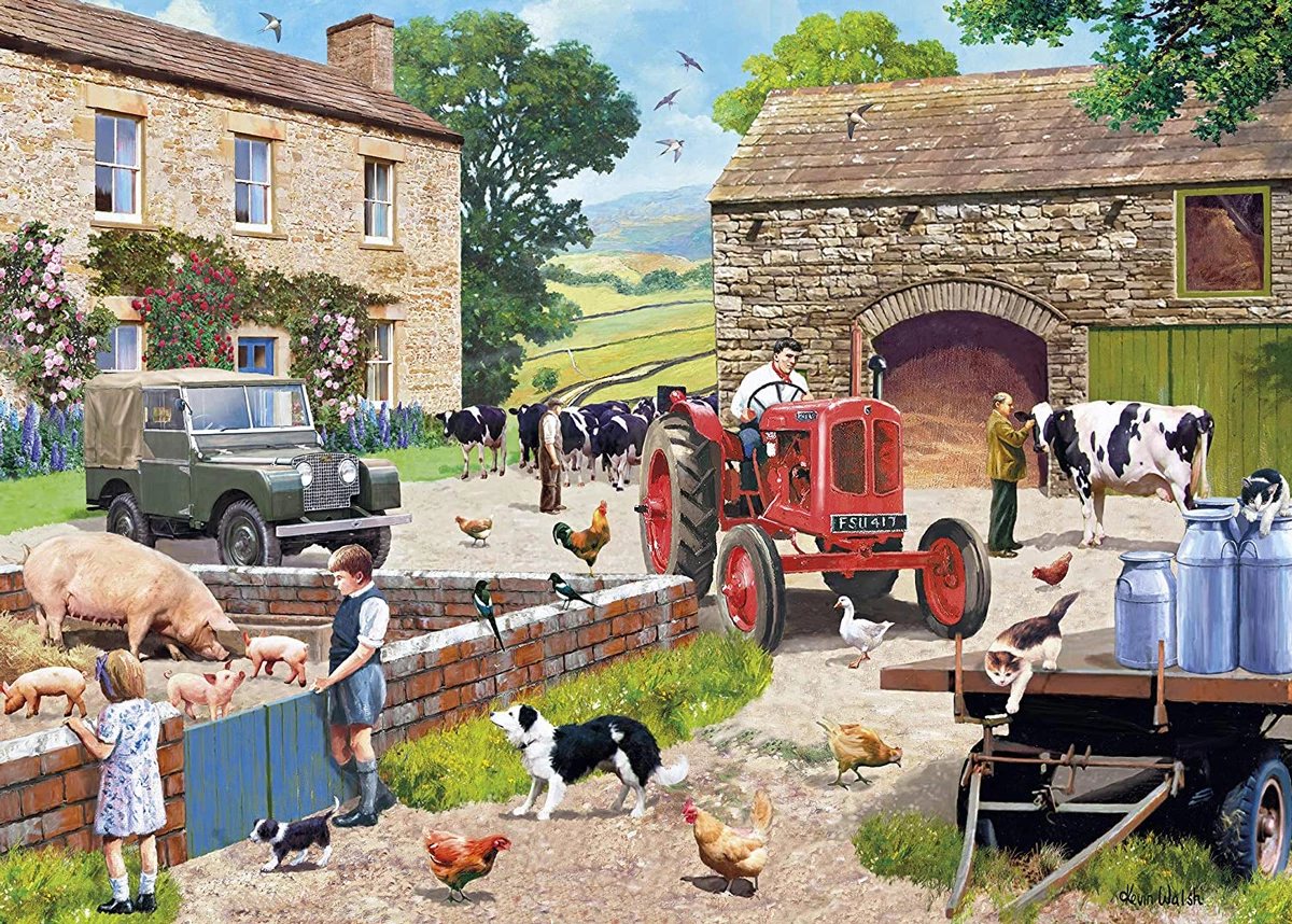 1000 18.89″ x 26.77″ Itβs a busy afternoon at the farm. As the cows are brought in for milking, Paul and Anne watch the piglets play around in the mud. This 1000 piece puzzle was painted by the talent Kevin Walsh, who is known for his nostalgic scenes and has many jigsaws in the Gibsons range.
