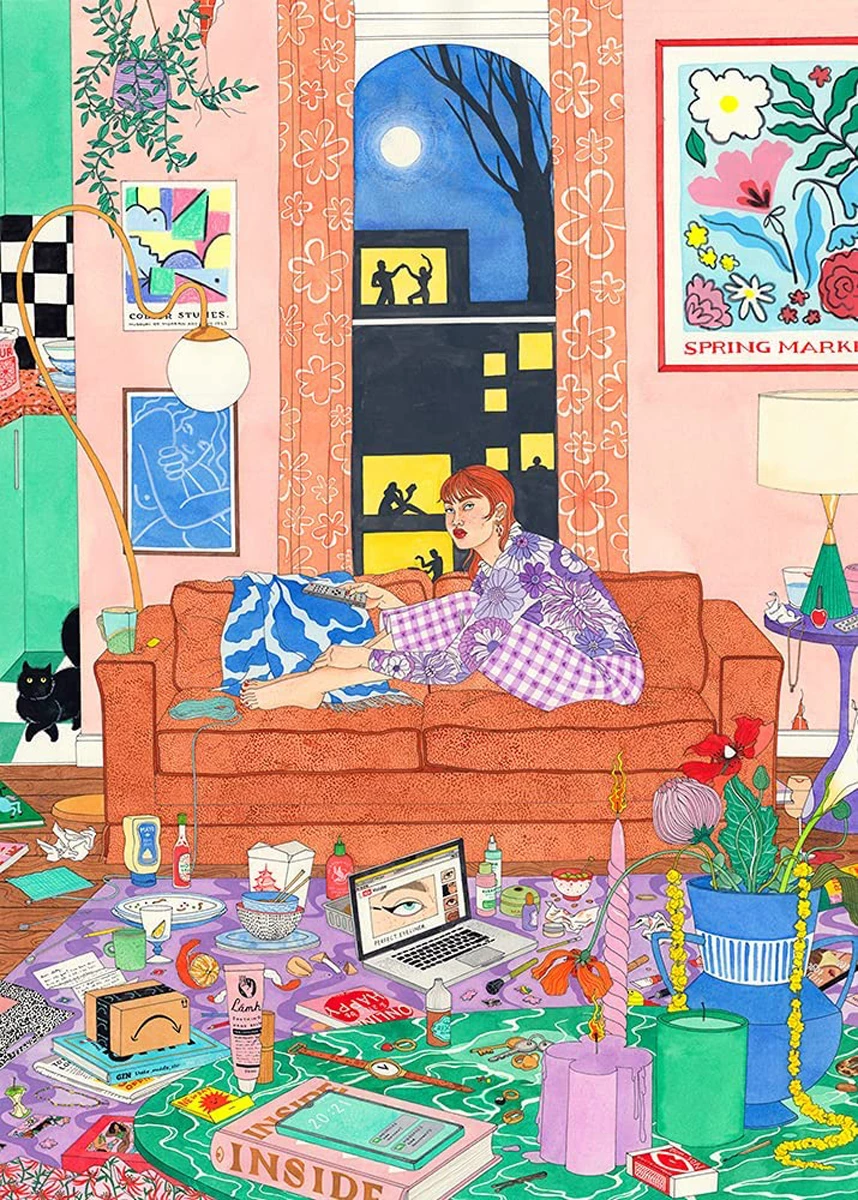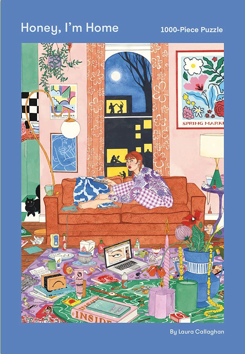 1000 19.3 x 27″, 68.5 x 49cm Honey, I’m Home is a 1000-piece puzzle depicting a woman who has become one with her apartment – lounging around and surrounded by her favorite things. This fun, colorful and maximalist scene is perfect for puzzling. Illustrated by London based artist Laura Callaghan. Brimming with hidden detail and eye-catching designs, the Piece Full puzzle series offers beautiful projects for mindful gamers and art lovers alike. The puzzle takes between 3-10 hours to piece together and measures 68.5 x 49 cm once completed. The Piece Full puzzle series is a collection of illustrated puzzles by artists from all over the world. You are compelled to piece the puzzle together as the images are so beautiful – you will want to frame them! A perfect gift as well as self purchase.