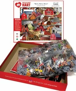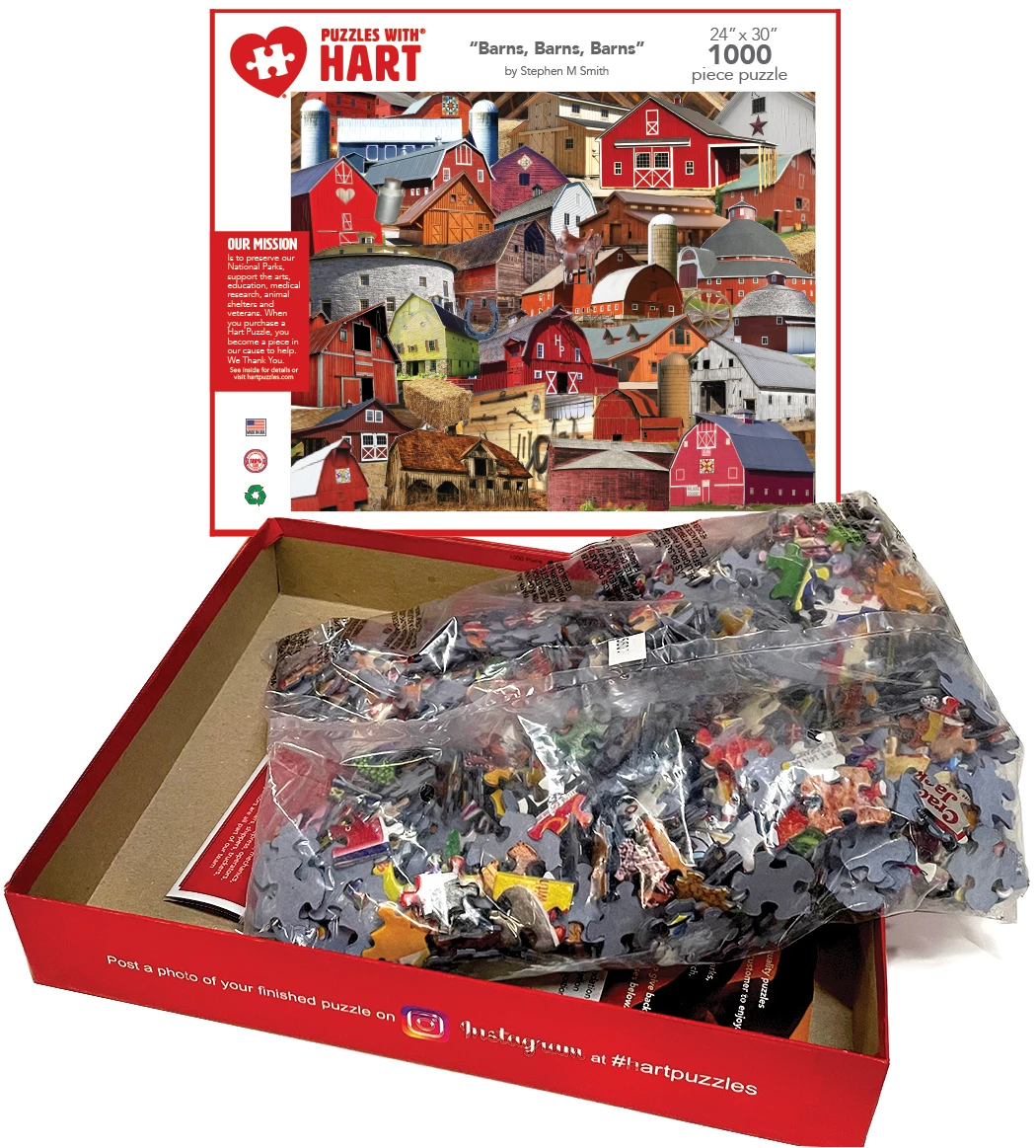 Throughout history the modern barn largely developed from the three-aisled medieval barn, commonly known as tithe barn or monastic barn. Todayβs modern barns are more typically steel buildings. From about 1900 to 1940, many large dairy barns were built in northern USA with gambrel or hip roofs. As you travel across the USA you can see the New England barn, prairie barns, round barns, new world Dutch barns, cantilever barns, even the simple pole barn. All dotted throughout our agricultural landscape in this 24″x 30″ 1000 piece puzzle. By Stephen M Smith