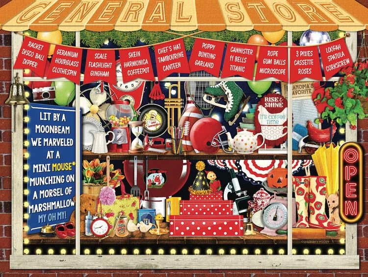 Nothing βgeneralβ about this magical, marvelous, miraculous small-town general store.Β Explore using words starting with the letter ‘M’ in this Seek & Find puzzle designed by Imaginary Studios. Have a memorable and merry time with this 18βx 24β 500-piece puzzle designed by Imaginary Studios.