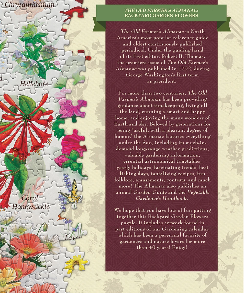 This 1000pc Puzzle are beautiful and intricate illustrations are drawn entirely by hand. Each custom-crafted field guide is incredibly detailed and features original illustrations from Farmer’s Almanac. Made 100% in the United States, these puzzles are made on the highest quality recycled blueboard and packaged in sophisticated matte-finish display boxes.