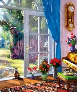 The light spring breeze fills the air of the piano room with fragrant flowers. Open the terrace doors onto a colorful garden trellis and soft light threw the trees. Stroll down to the fountain and enjoy the sunshine.