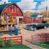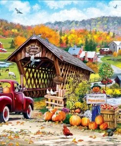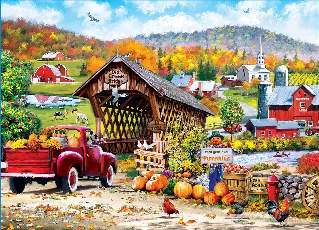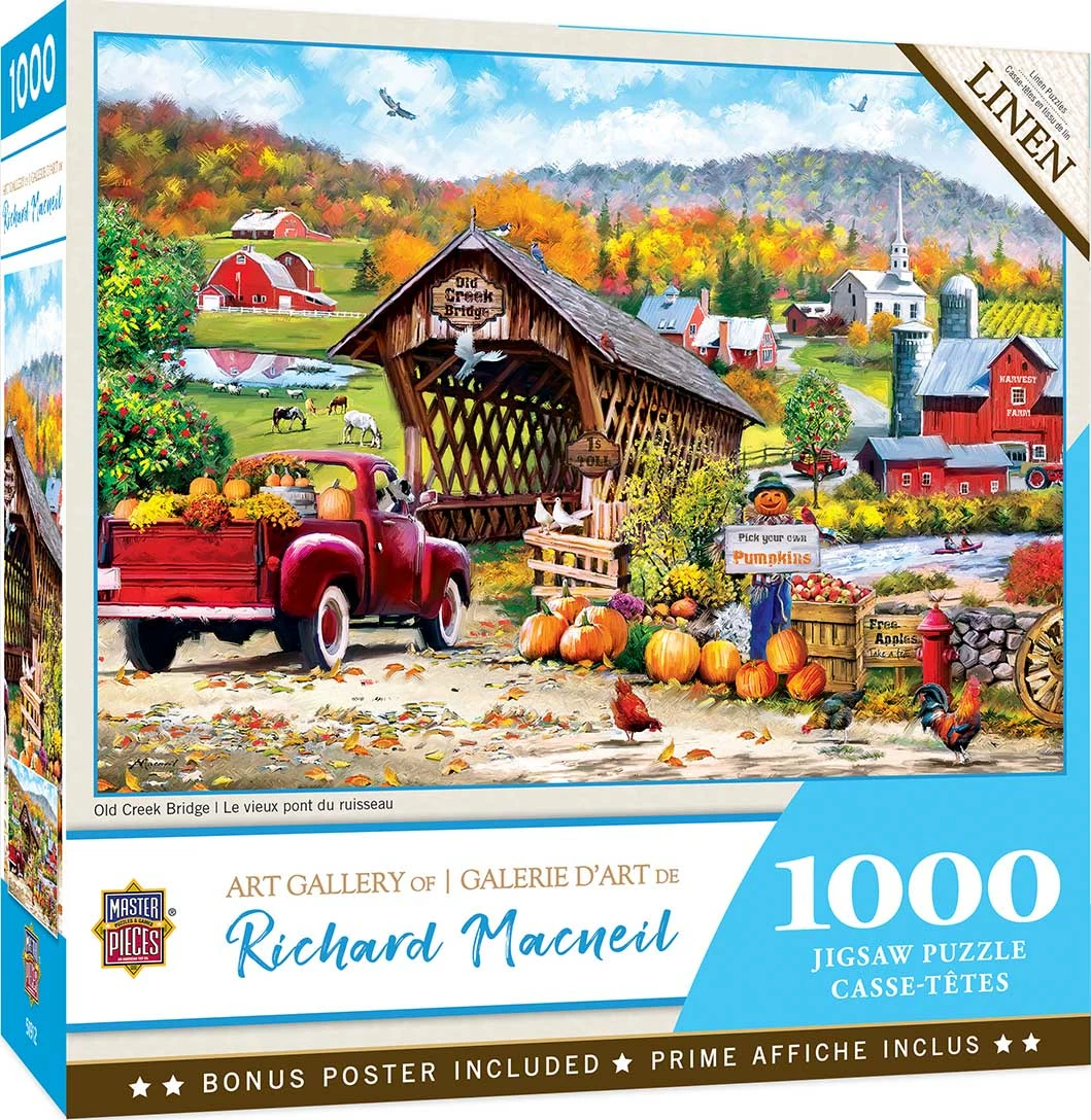 In this MasterPieces 19.25″ x 26.75″ 1000pc Richard McNeil puzzle, The Old Creek Bridge leads to a quaint farm town past the river.
