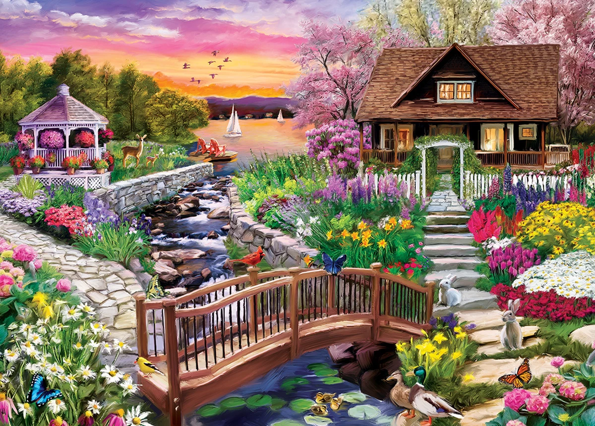 This Masterpieces 1000pc Puzzle of colorful blooms on a babbling brook in springtime near the shore is made on the highest quality recycled blue board and printed on linen paper for a shine-free easy-to-grip image and packaged in sophisticated linen-finish display boxes.