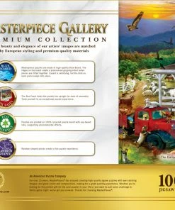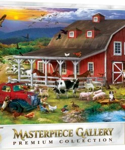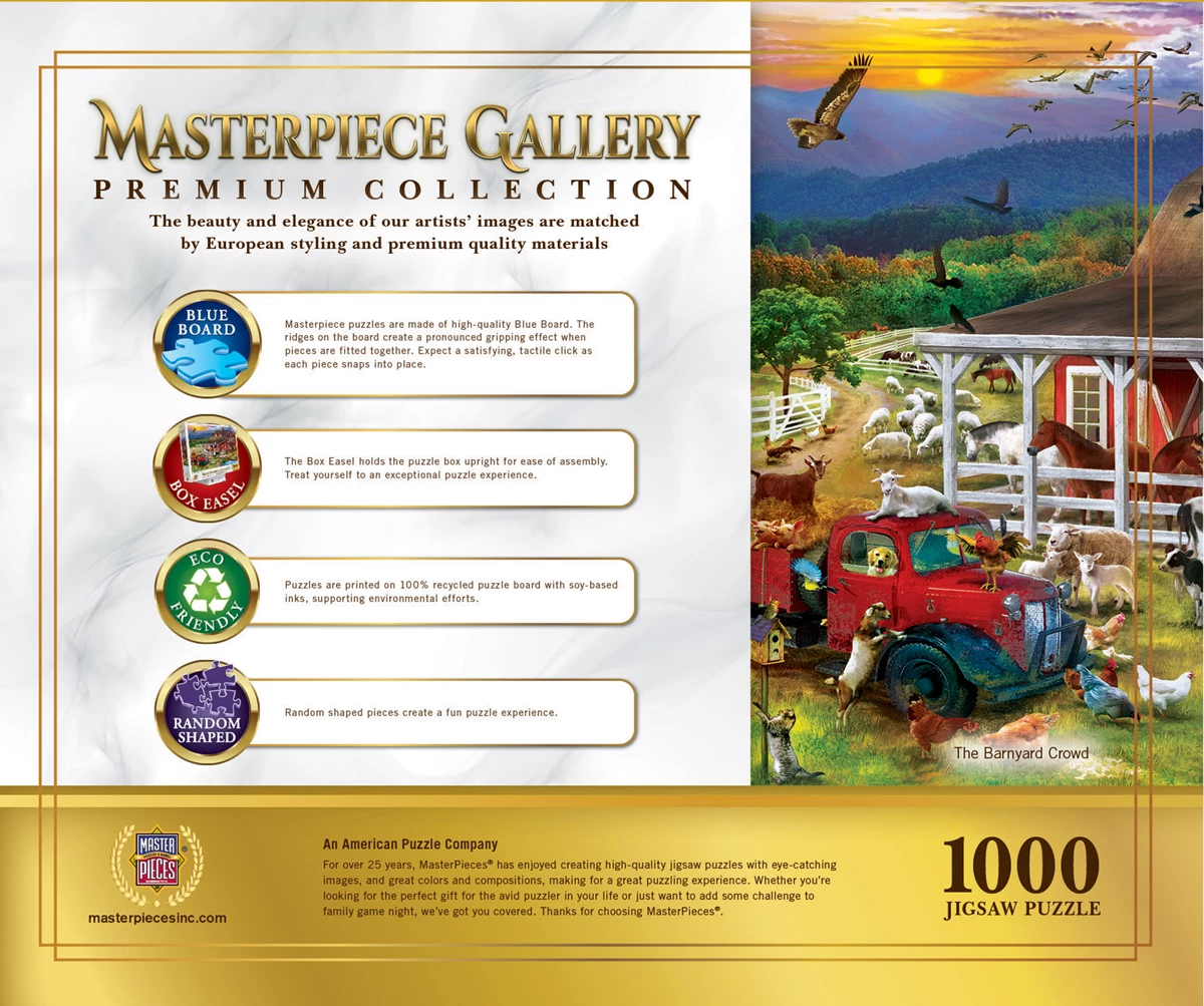 This Masterpieces 1000pc Puzzle of a gathering of adorable farm animals enjoy the sunset is made on the highest quality recycled blue board and printed on linen paper for a shine-free easy-to-grip image and packaged in sophisticated linen-finish display boxes.