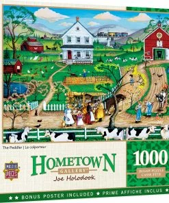 These MasterPieces 19.25″ x 26.75″ 1000pc Hometown Gallery Puzzles are painted by the talented folk artist, Joe Holodook, and they feature beautiful, vintage scenes that remind us all of simpler times. Β The roaming Peddler comes by with his wagon of wares. To reduce their impact on our environment, the chipboard used in these puzzles is made of recycled material. In the small towns and villages of Joe Holodookβs America you can sip the cider, sit by the cracker barrel, go sugaring and skating in the winter and enjoy life as it used to be, and perhaps ought to be. The artist has created hundreds of pieces of art for Β the traditional markets and galleries of the Hudson River Valley. Many of his works grace fine homes as well as major corporations, among them Ernst & Young and ITG Boston. Β He has also created restoration artwork for the Sacred Heart Church and for the St. Nicholas Ukrainian Catholic Church, both in his home town of Hudson, New York. 1000 Piece Puzzle Finished 19.25 inch x 26.75 inch Artwork by popular puzzle artist Linda Nelson Stocks Thick recycled puzzle board and random cut pieces ensure a tight interlocking fit and create a fun experience MasterPieces – An American Puzzle & Game Company. We stand behind our products and guarantee your satisfaction. Β