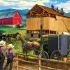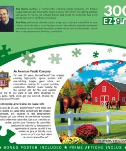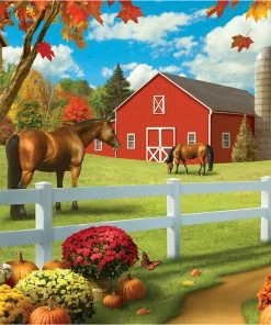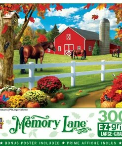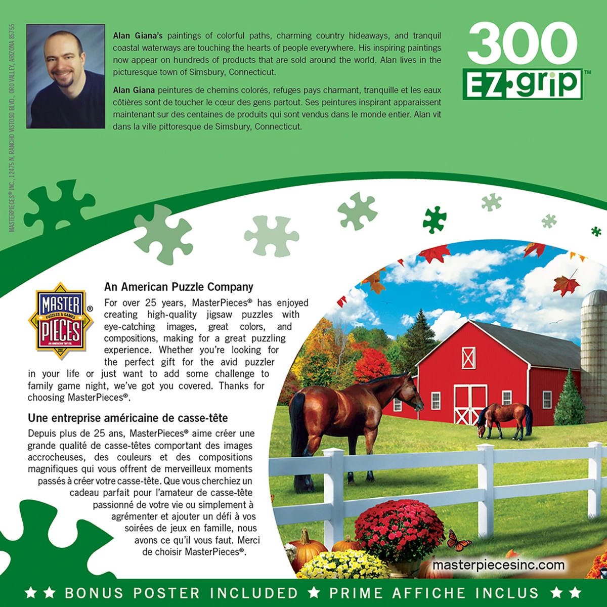 This MasterPieces 18″ x 24″ Memory Lane 300PC EZ Grip Puzzle depicts a festive fall scene, complete with pumpkins, orange leaves falling from the trees, a big red barn, and beautiful brown horses in the pasture. It was painted by the talented Alan Giana, whose paintings of colorful paths, charming country hideaways, and tranquil coastal gateways are touching the hearts of people everywhere. His inspiring paintings now appear on hundreds of products that are sold around the world. Alan lives with his loving wife, Pamela, in the picturesque town of Simsbury, Connecticut. The EZ-Grip technology used to make this puzzle offers larger puzzle pieces that snap together perfectly, without compromising image quality. To reduce its impact on our environment, the chipboard used in this puzzle is made of recycled material.