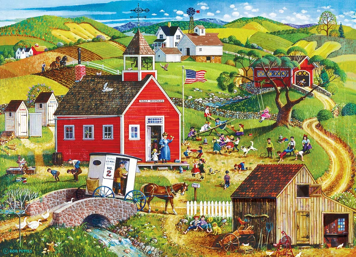 School Days displays detailed tones of warm colors with the use of yellows that help bring depth into the MasterPieces puzzle. The 500 piece puzzle features a small rural town as kids of the community go to school. This 10+ puzzle with a total size of 26.75″ x 19.25″ is a perfect challenge for any skill level and folk art fanatics.