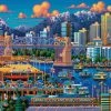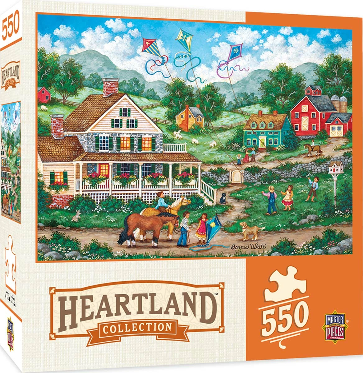 Crosswinds is a MasterPieces 550 piece puzzle featuring several children of a small rural town enjoying the weather by flying kites. The Folk Art by Bonnie White displays gorgeous colors that helps bring light into any area upon completion.