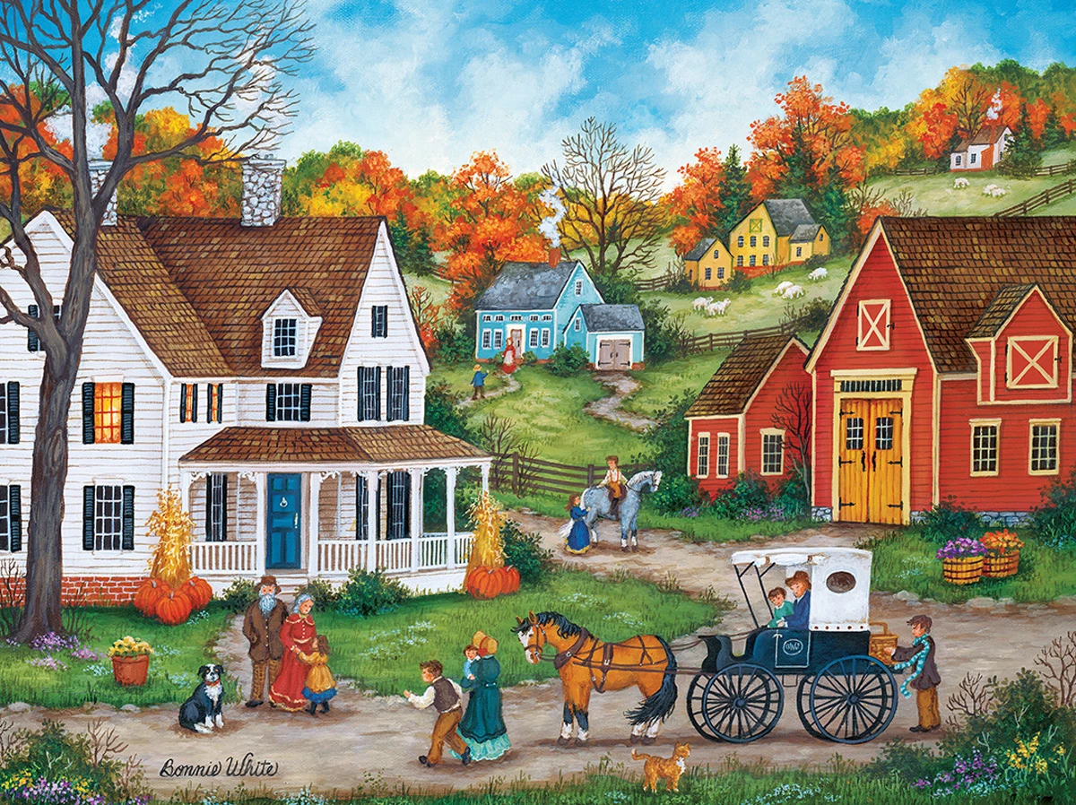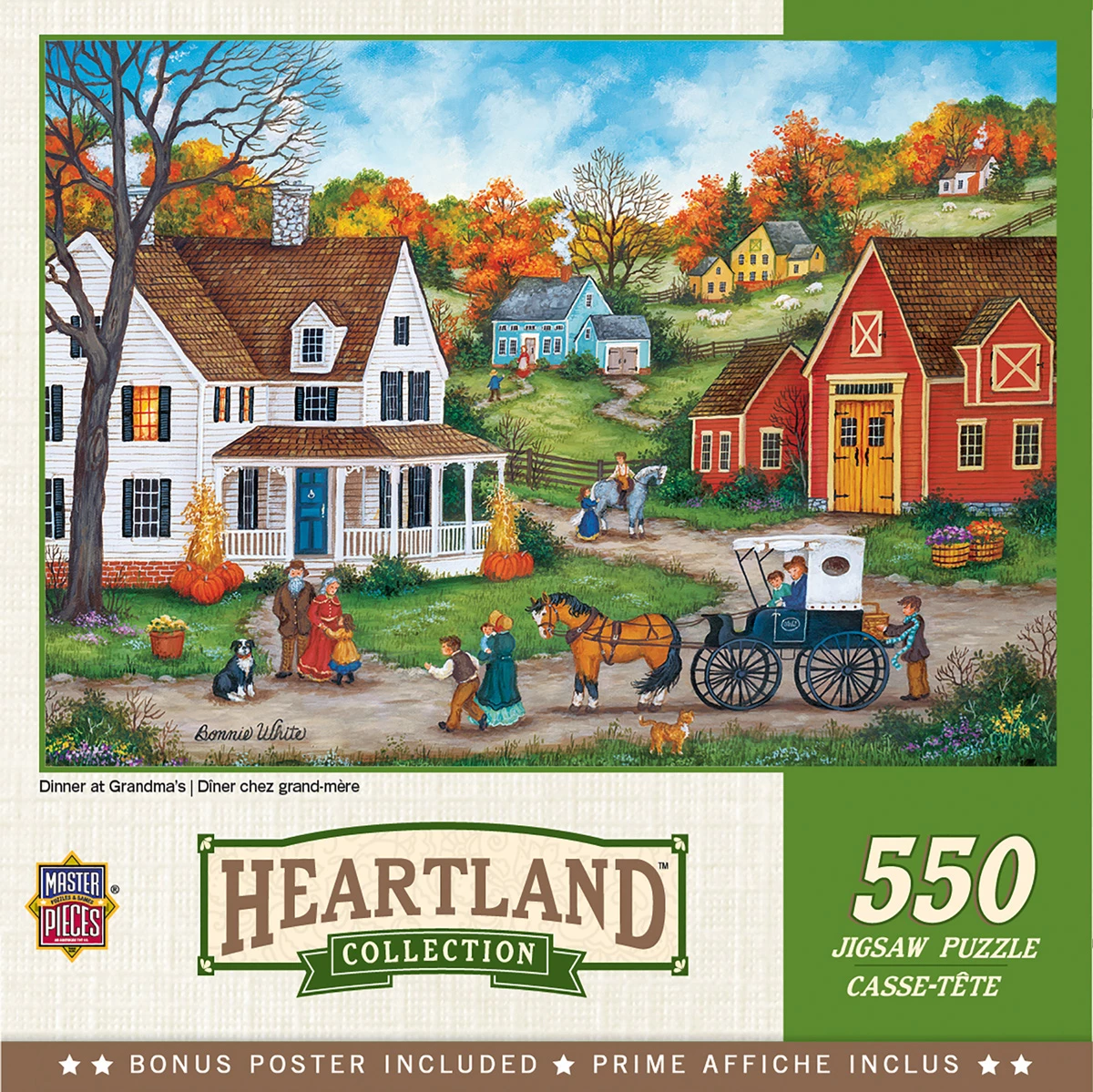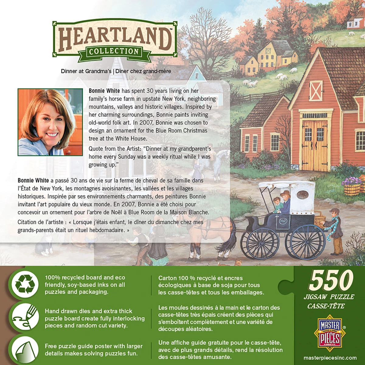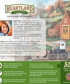These MasterPieces 24″ x 18″ 550PC Heartland puzzles are created by the talented Bonnie White. Inspired by the charming scenery on her family’s farm in upstate New York, as well as neighboring mountains, valleys, and historic villages, Bonnie White creates beautiful landscapes of old-world folk art and culture. The Heartland line is no exception, with beautiful, detailed scenes ranging from quiet, seaside villages to villages bustling with activity. To reduce their impact on our environment, the chipboard used in these puzzles is made of recycled material.