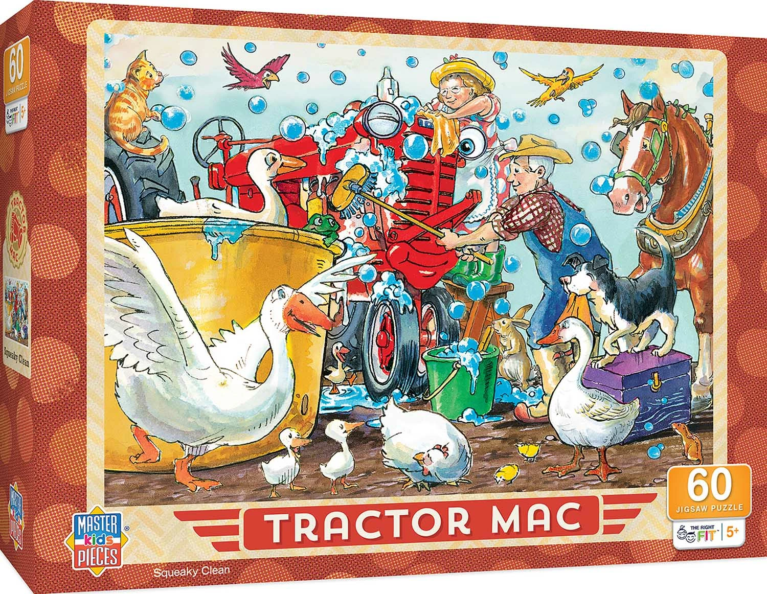 Tractor Mac is a book series about a little red tractor named Mac and his group of friends who live on Stony Meadow Farm. ย Together they learn important values about belonging, family, hard work and friendship. This puzzle is 60 pieces and 19 inches x 14 inches in size. Look for The Right Fitยฎ puzzles collection and make sure your little one gets the correct piece count and size for a good challenge for their age. This puzzle is the right fit for ages 5+.