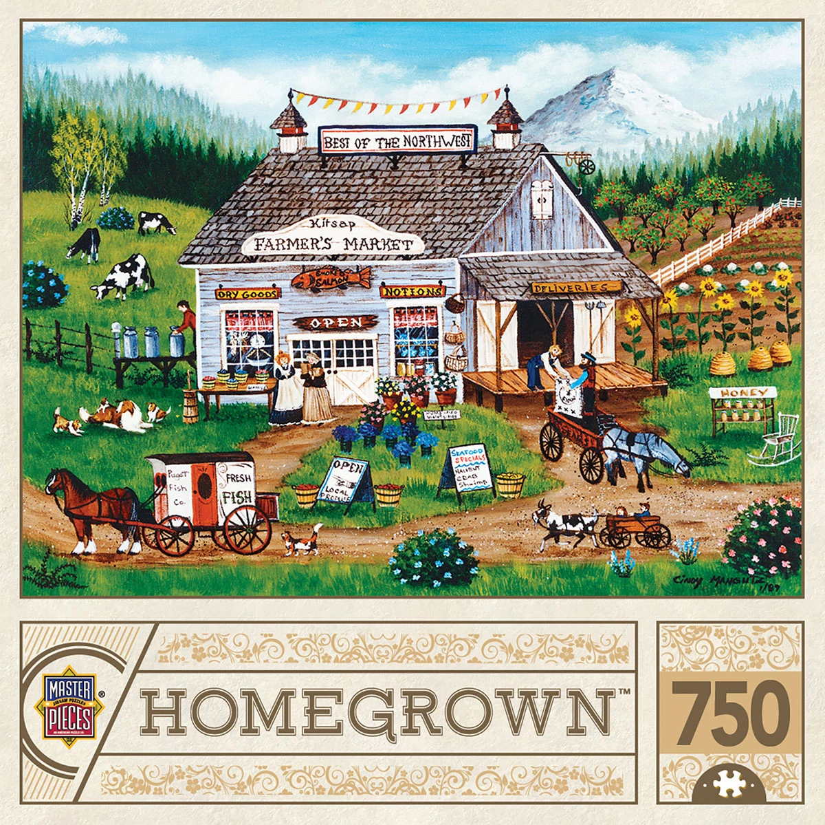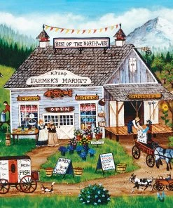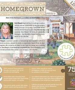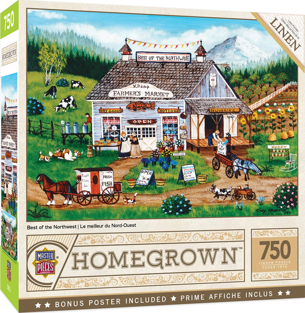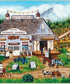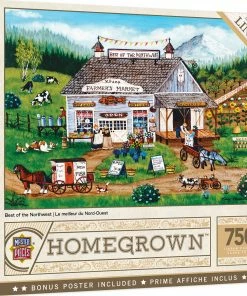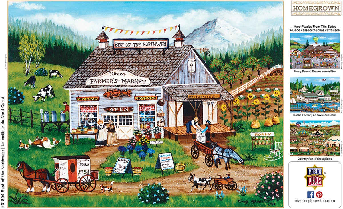 This MasterPieces 750pc Homegrown Puzzle of Best of Northwest features a local country store with dairy cows roaming and sunflowers growing and suppliers picking up deliveries. This folk art collection features the talented work of Art Poulin. This puzzle is made of linen material which makes it easier to grip and see with no-glare. This linen puzzle is the perfect gift for any puzzle lover! To reduce its impact on our environment, the chipboard used in this puzzle is made of recycled material.