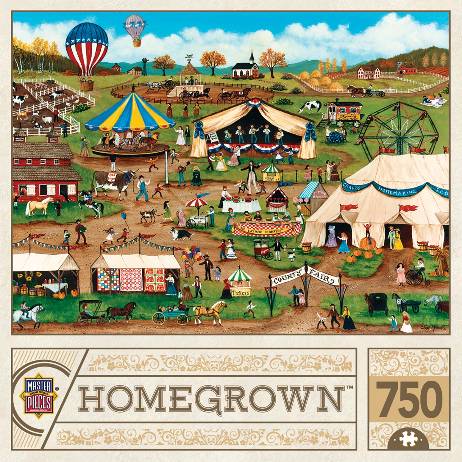This MasterPieces 750pc Homegrown Puzzle of Country Fair features a folk art scene of a day at the fair with live music, a petting zoo, and tons of activities all around. This folk art collection features the talented work of Art Poulin. This puzzle is made of linen material which makes it easier to grip and see with no-glare. This linen puzzle is the perfect gift for any puzzle lover! To reduce its impact on our environment, the chipboard used in this puzzle is made of recycled material.