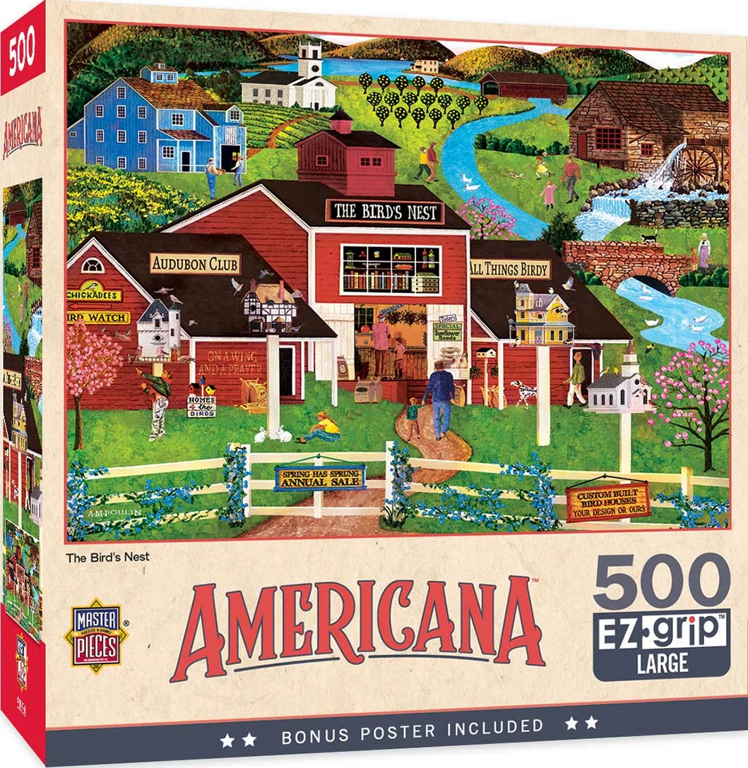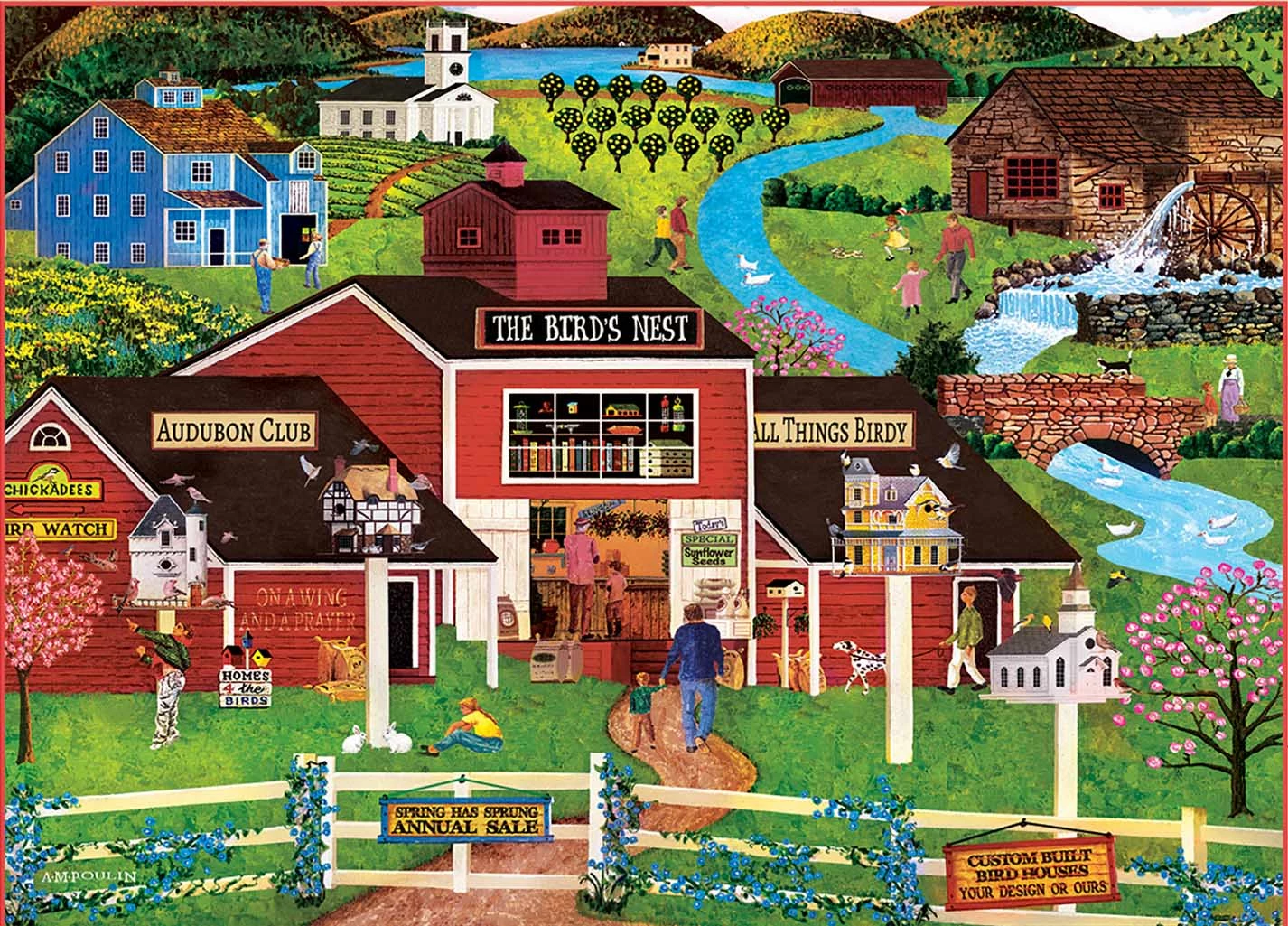 This MasterPieces 19.25″ x 26.75″ 500pc EZ Grip Puzzle was painted by AM Poulin. Spring has sprung at the local birdwatcher’s club.ย Nostalgic and colorful these images are true American folk art classics.ย The EZ-Grip technology used to make this puzzle offers larger puzzle pieces that snap together perfectly, without compromising image quality. To reduce its impact on our environment, the chipboard used in this puzzle is made of recycled material