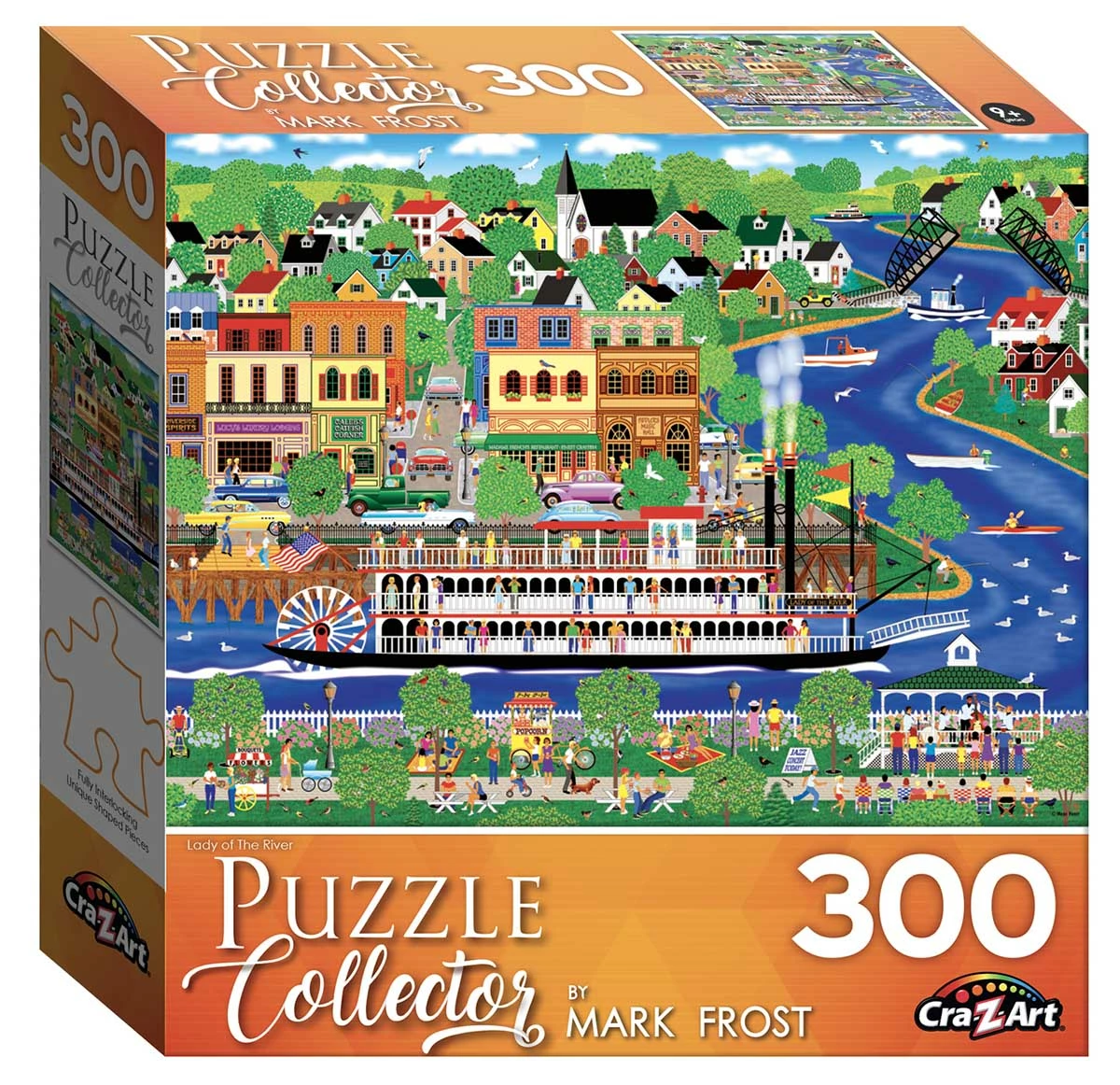 Mark Frost paints a picture of a lady of the river, a fantastic boat, as it passes through an old american town, in this 300 piece jigsaw puzzle from RoseArt.