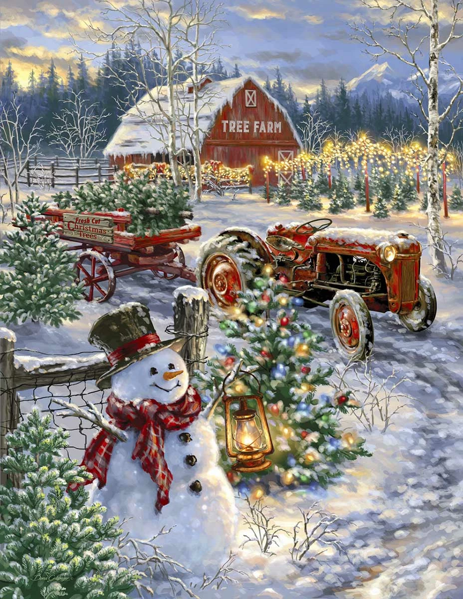 A chipper looking snowman invites you to stop on by this Christmas Tree Farm, and maybe pick up a beautiful tree for the holidays. Β Enjoy the winter wonderland in full by assembling this holly jolly 1000 piece jigsaw puzzle from Springbok.