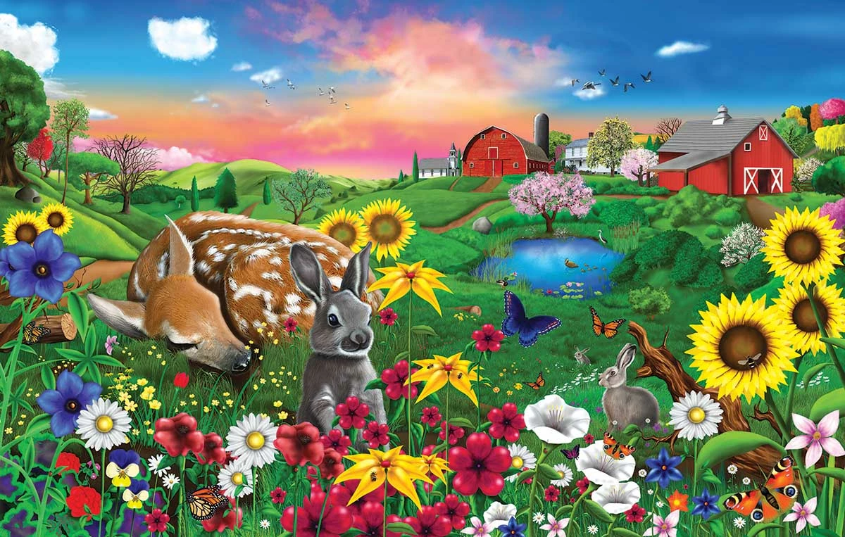 Some sweet animals are enjoying a beautiful day on the farm in SunsOutβs βPasture Buddiesβ. This 100 piece puzzle features the artwork of Gerald Newton. His artwork is colorful and bright and will have you smiling as you are puzzling. This puzzle will be 10β x 16β when completed.Β